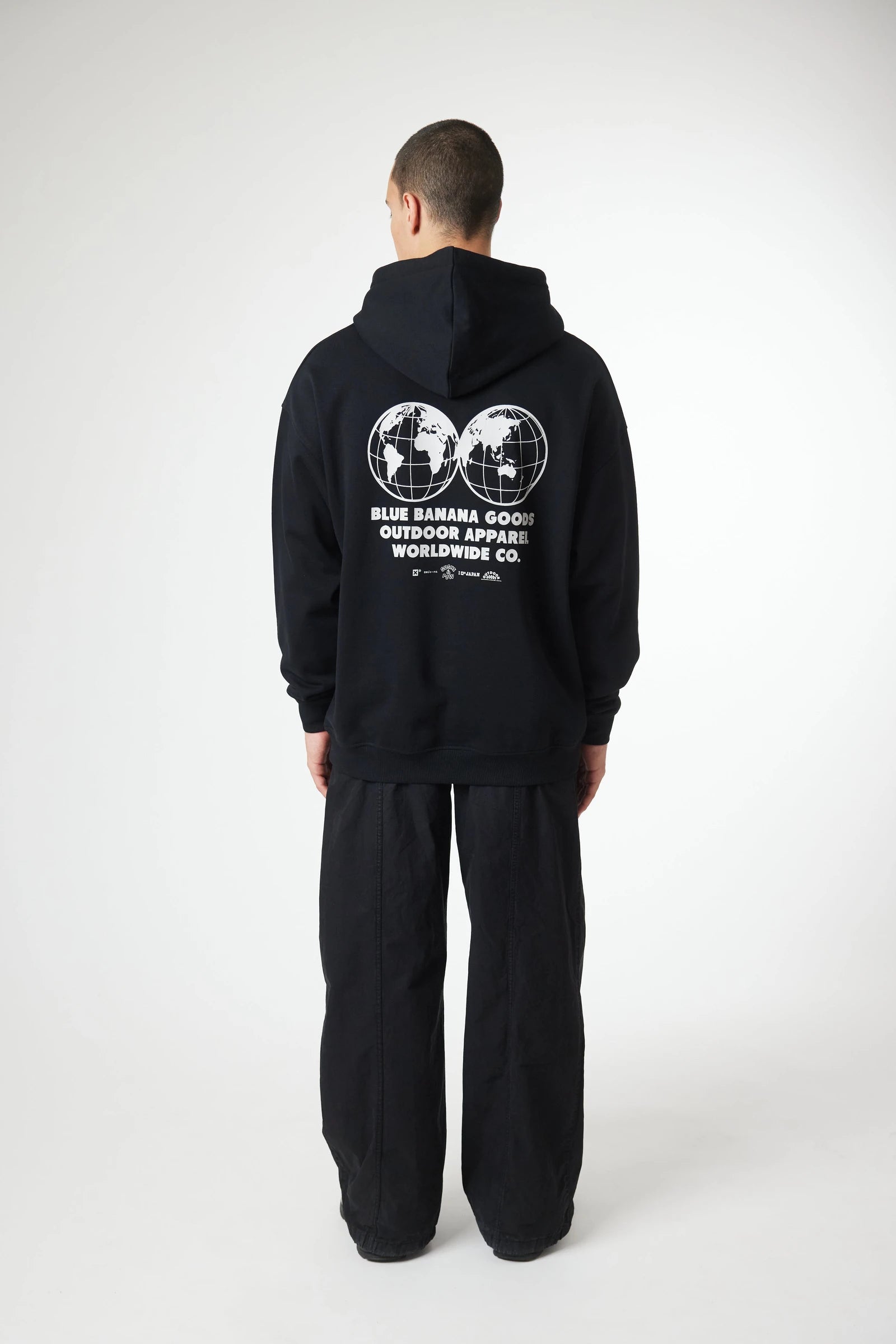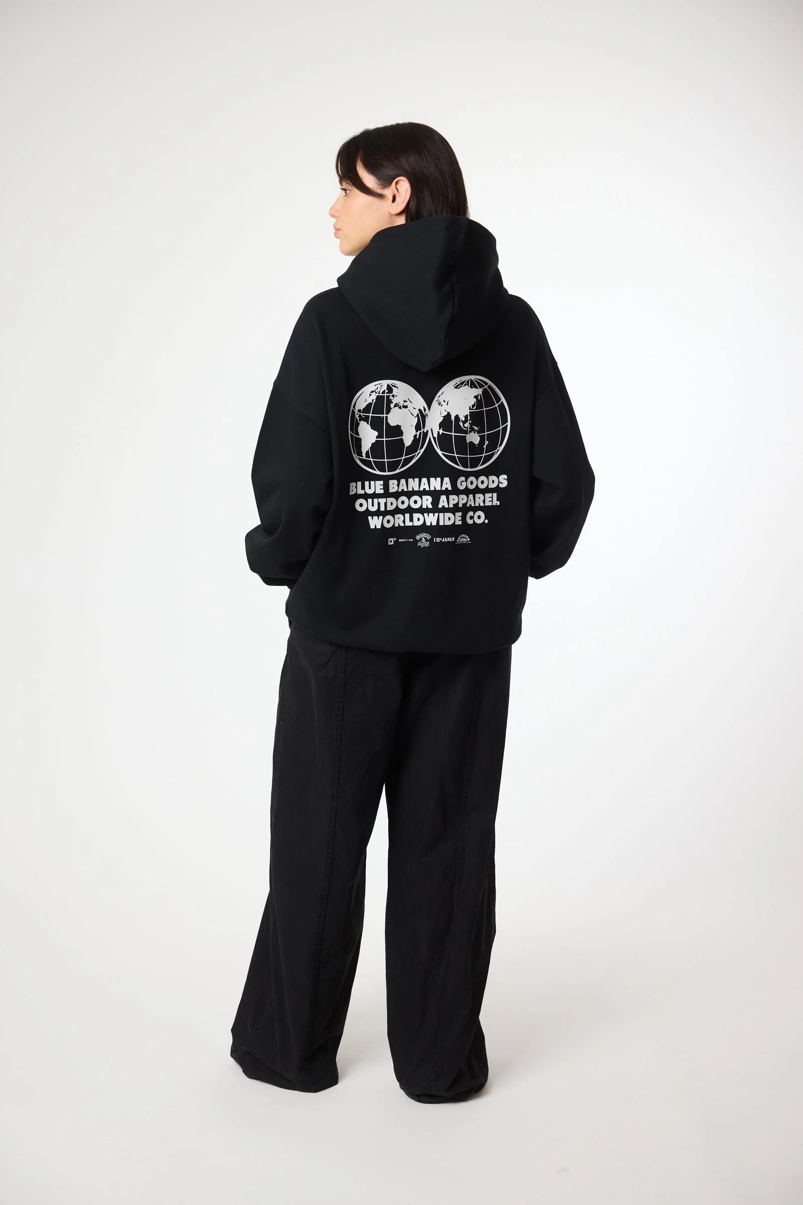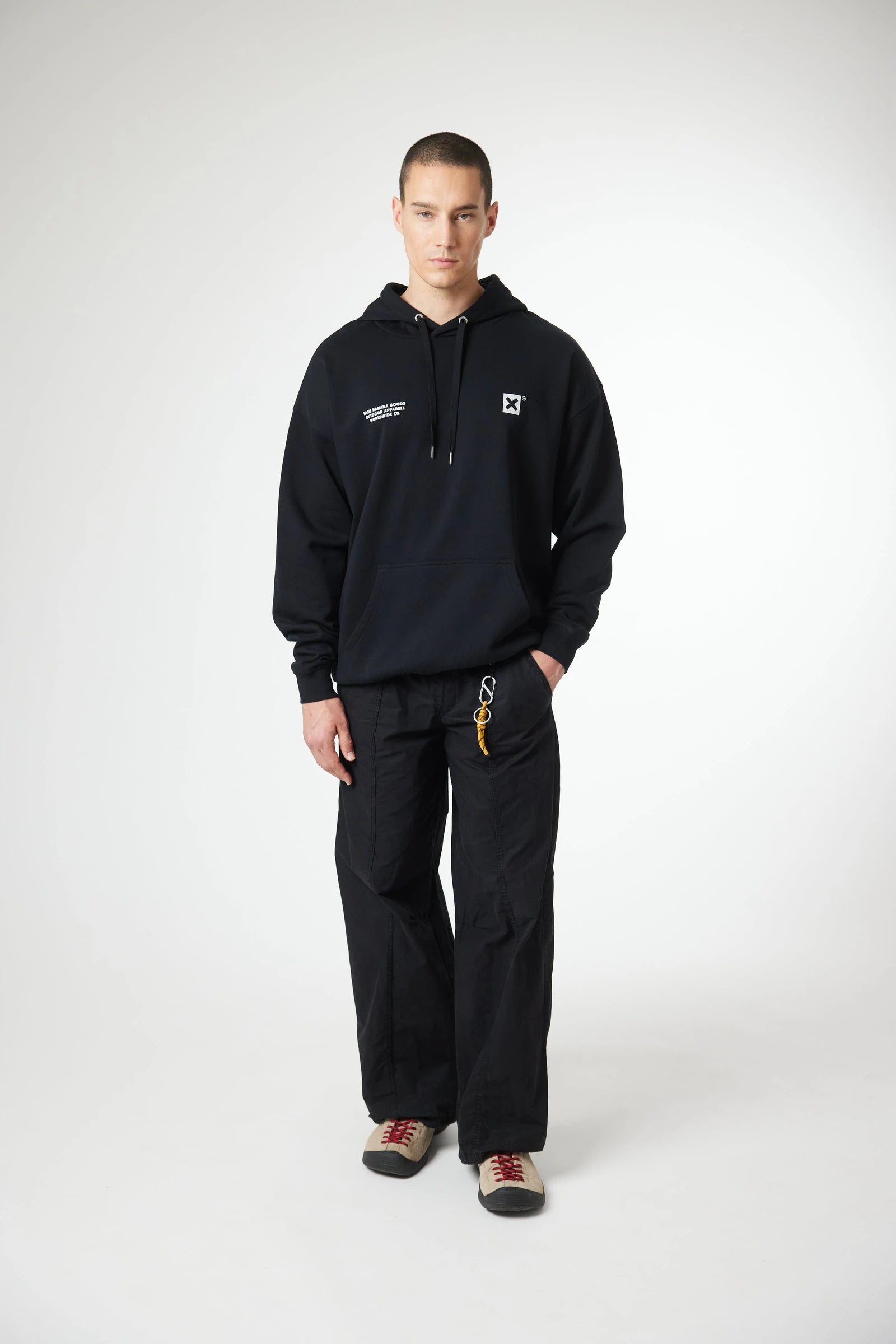 Hoodie with front print on the upper left side and centered back print. Front lower central pocket with openings on both sides. Made of 100% organic cotton and oversized fit.