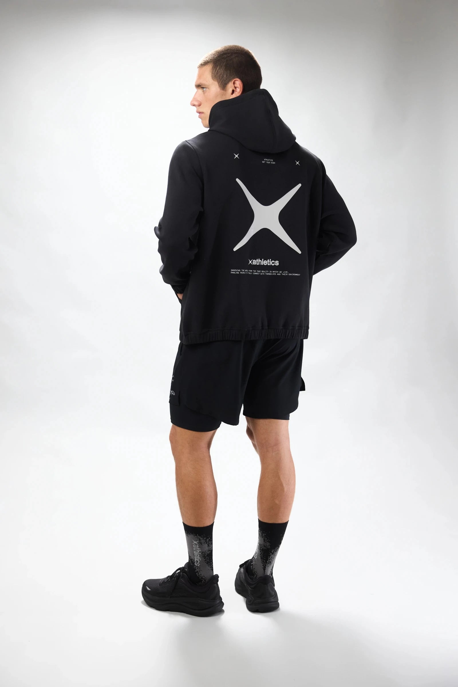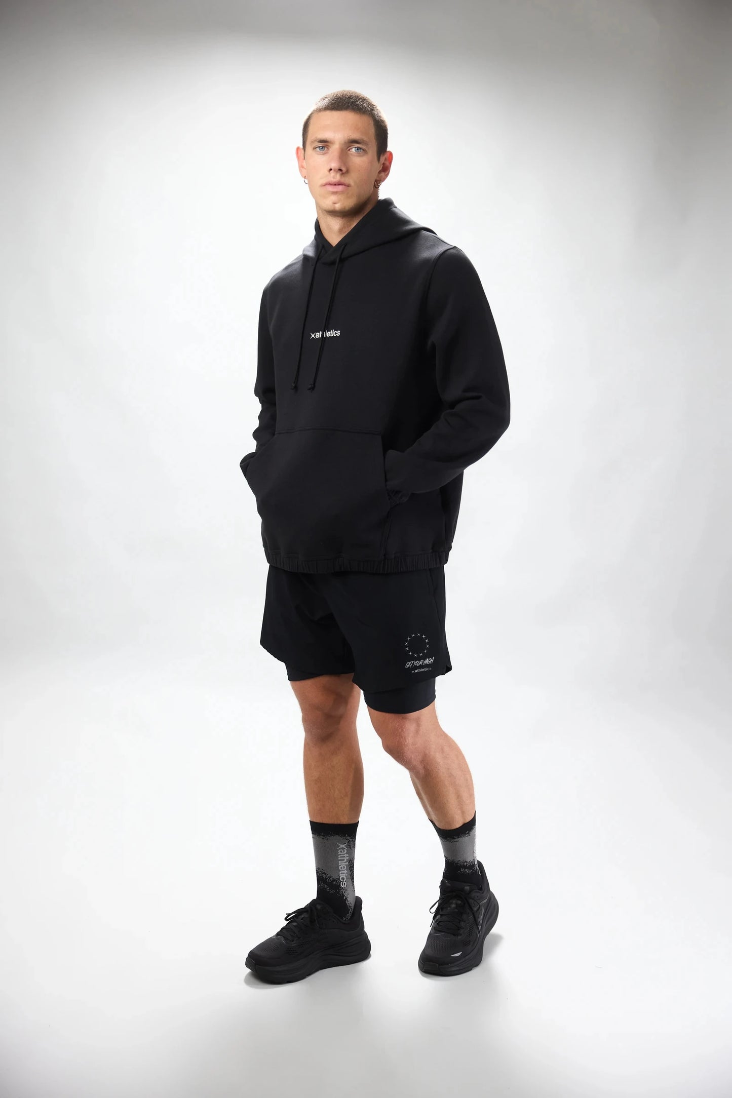 Hoodie made from cotton and polyester. Elastic waistband adjustable at the hem. Kangaroo pocket with zippers. Logo on the front center and back center.