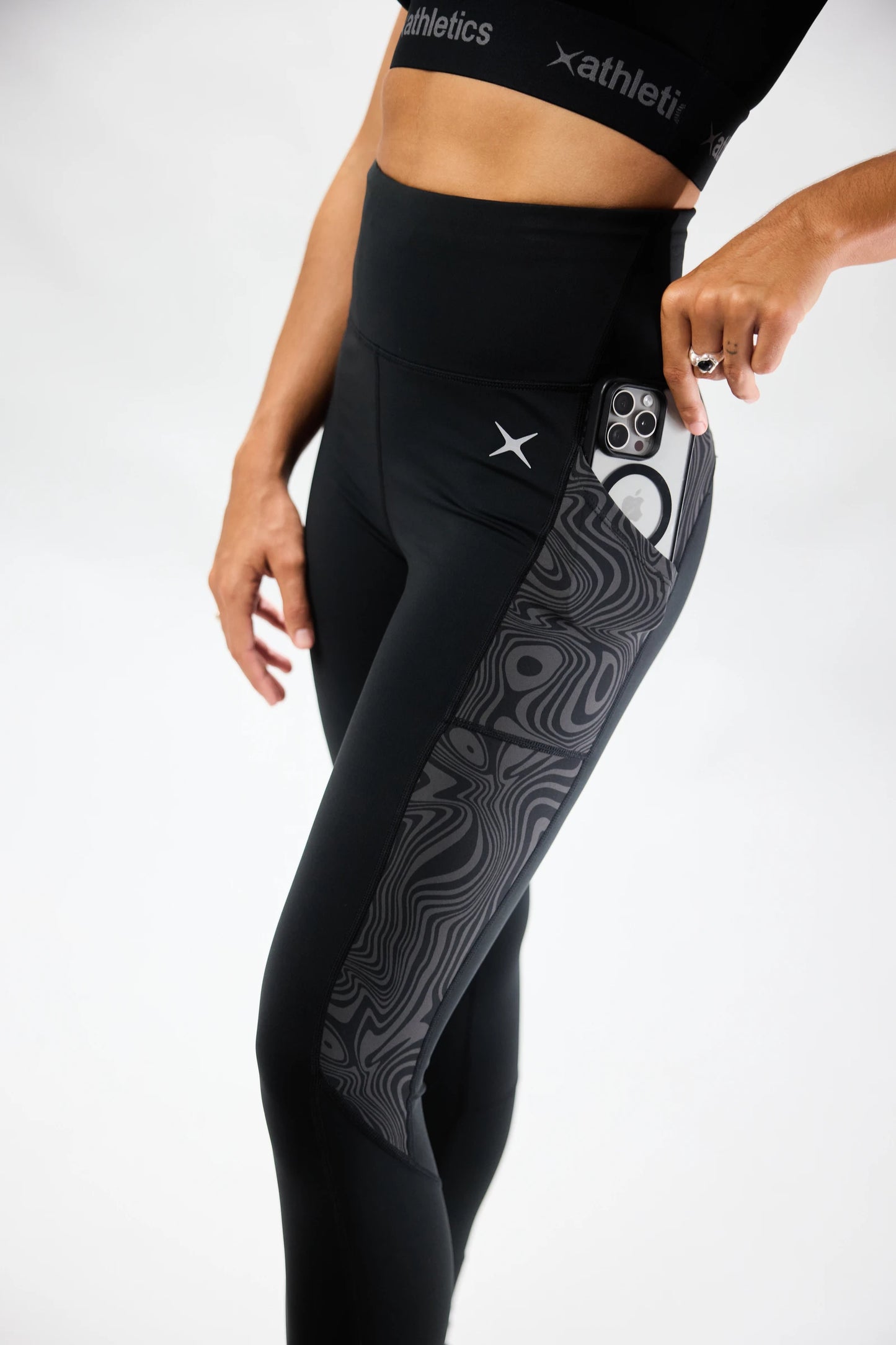 Long sports leggings made of nylon and sport lycra, quick-drying, UV50, and breathable. Strategic laser perforations on the calf. Reflective details at the hem. Reflective logo on the upper left side and lower right back. Side pockets at the top.