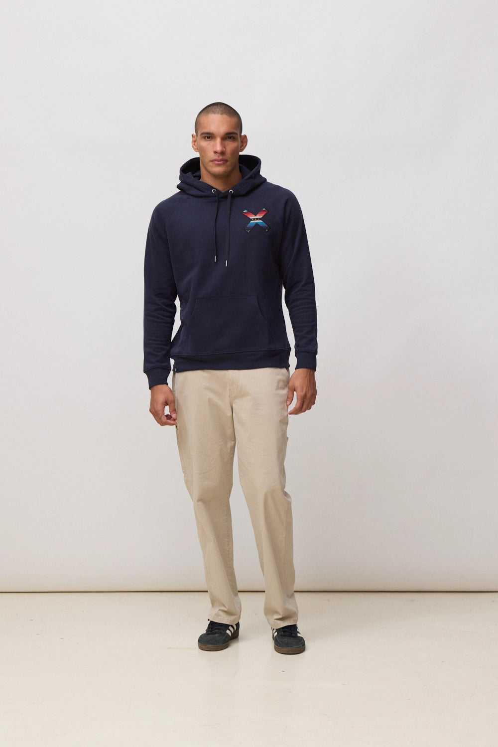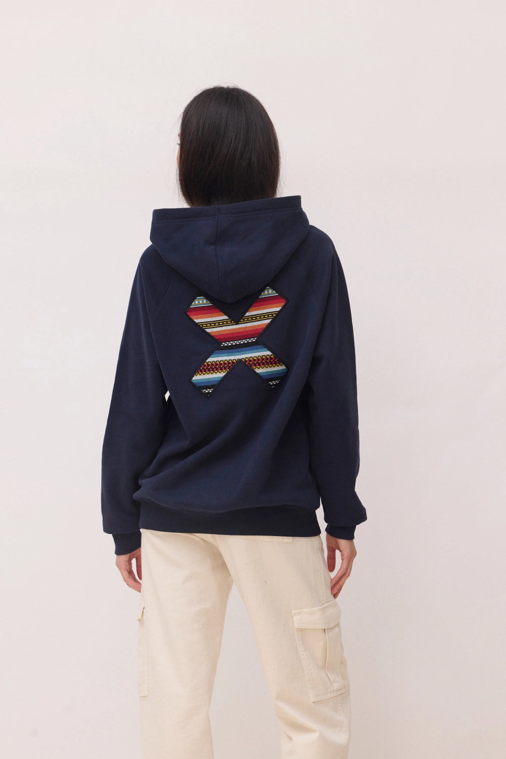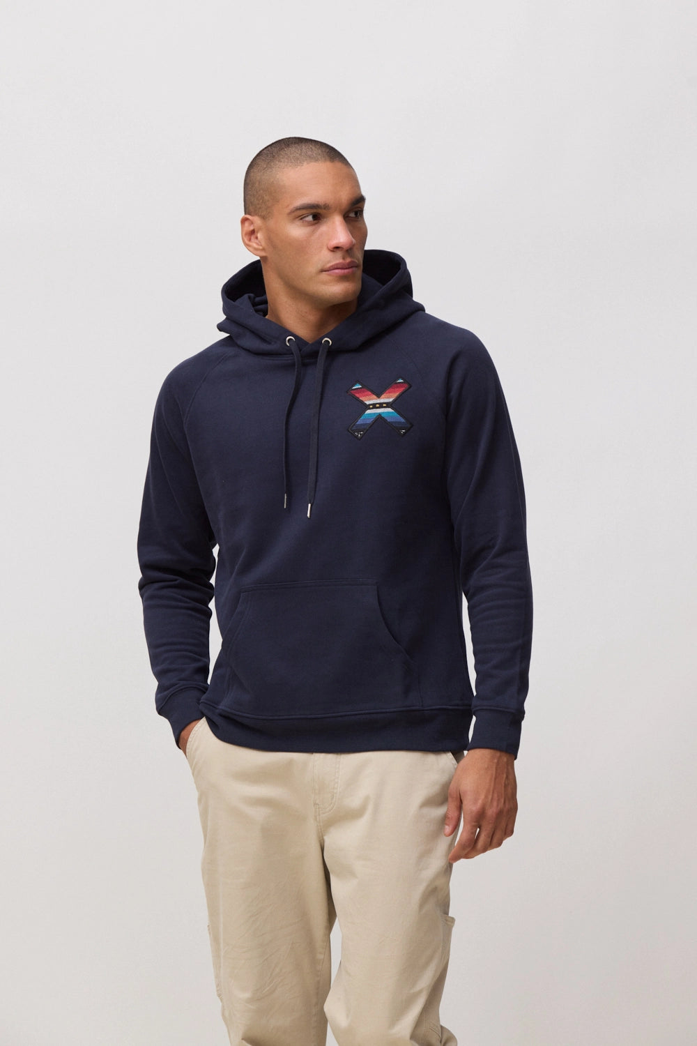 Hoodie with our classic embroidered X: front on the chest and back on the back. Lower central front pocket with opening on both sides. Made with 100% organic cotton and regular fit cut.