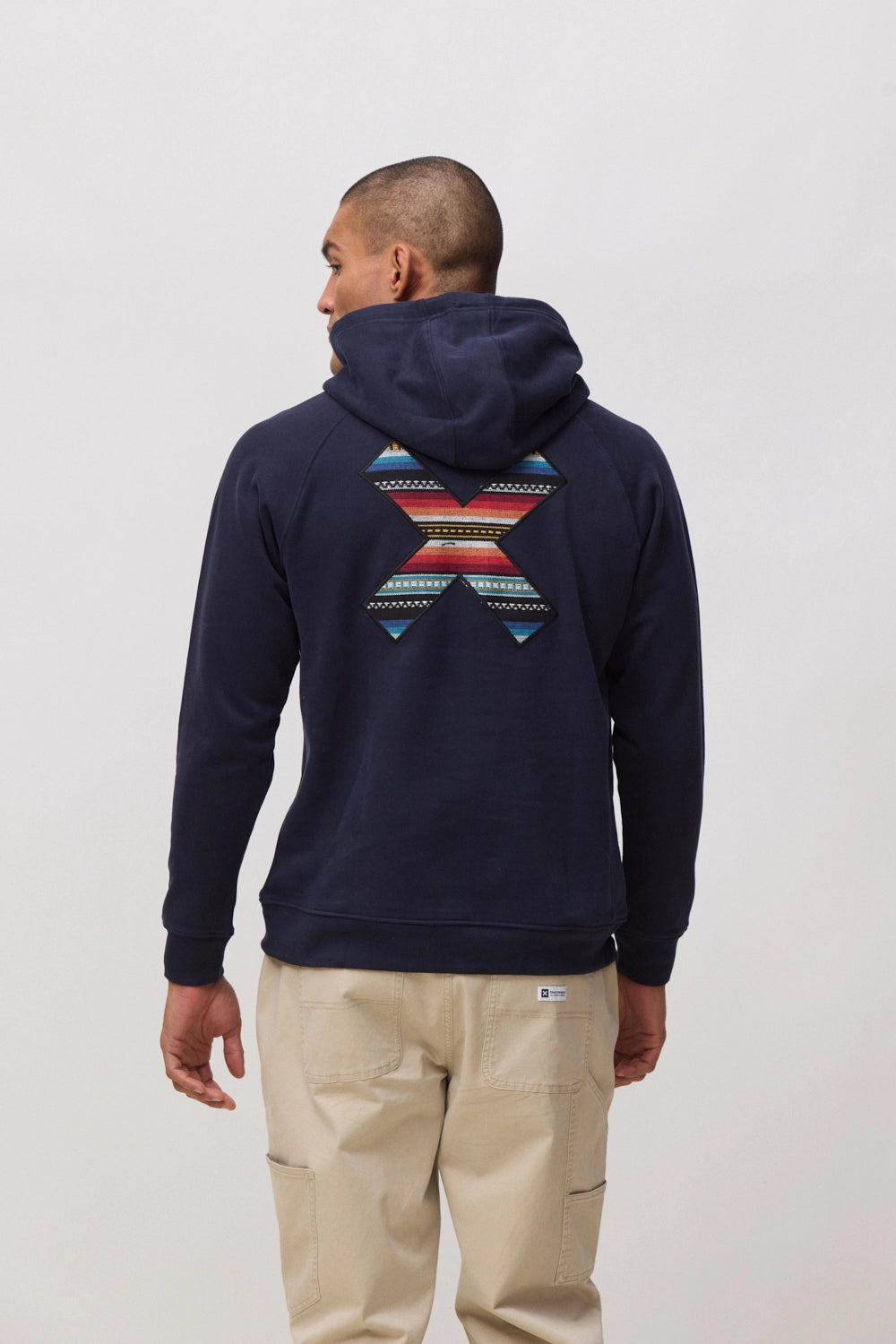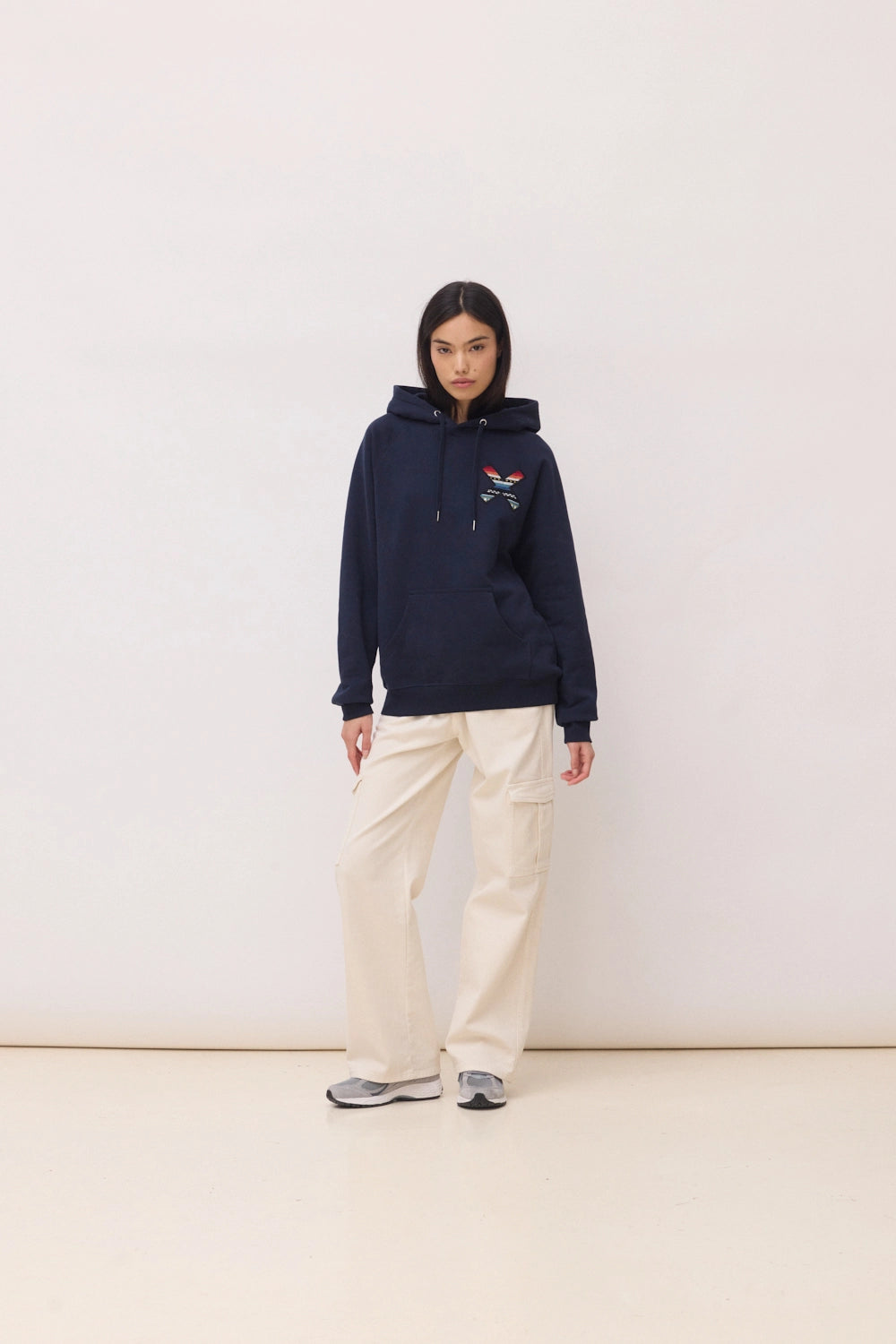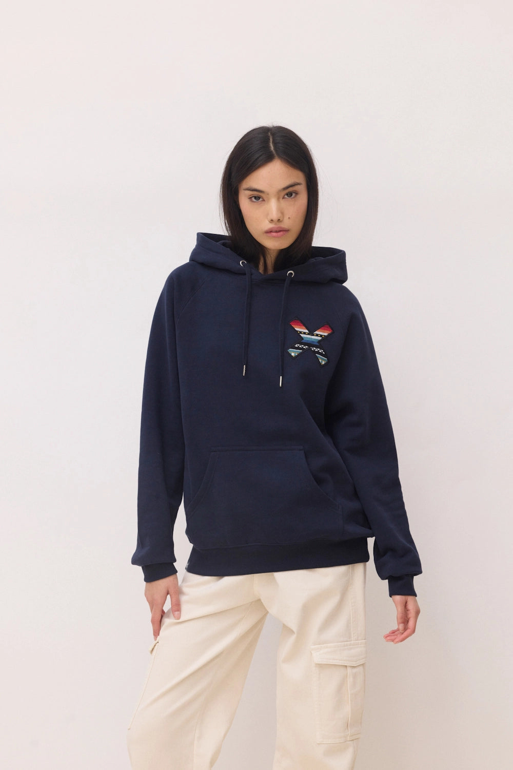 Hoodie with our classic embroidered X: front on the chest and back on the back. Lower central front pocket with opening on both sides. Made with 100% organic cotton and regular fit cut.