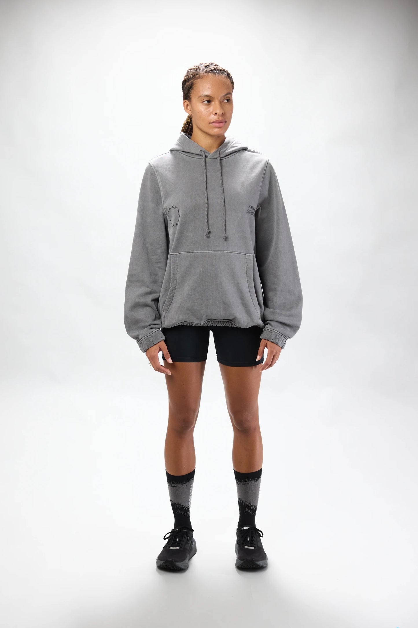 Washed effect hoodie made of 100% cotton. Elastic adjustable hem at the waist. Kangaroo pocket with zippers. Logo on the central front and central back.