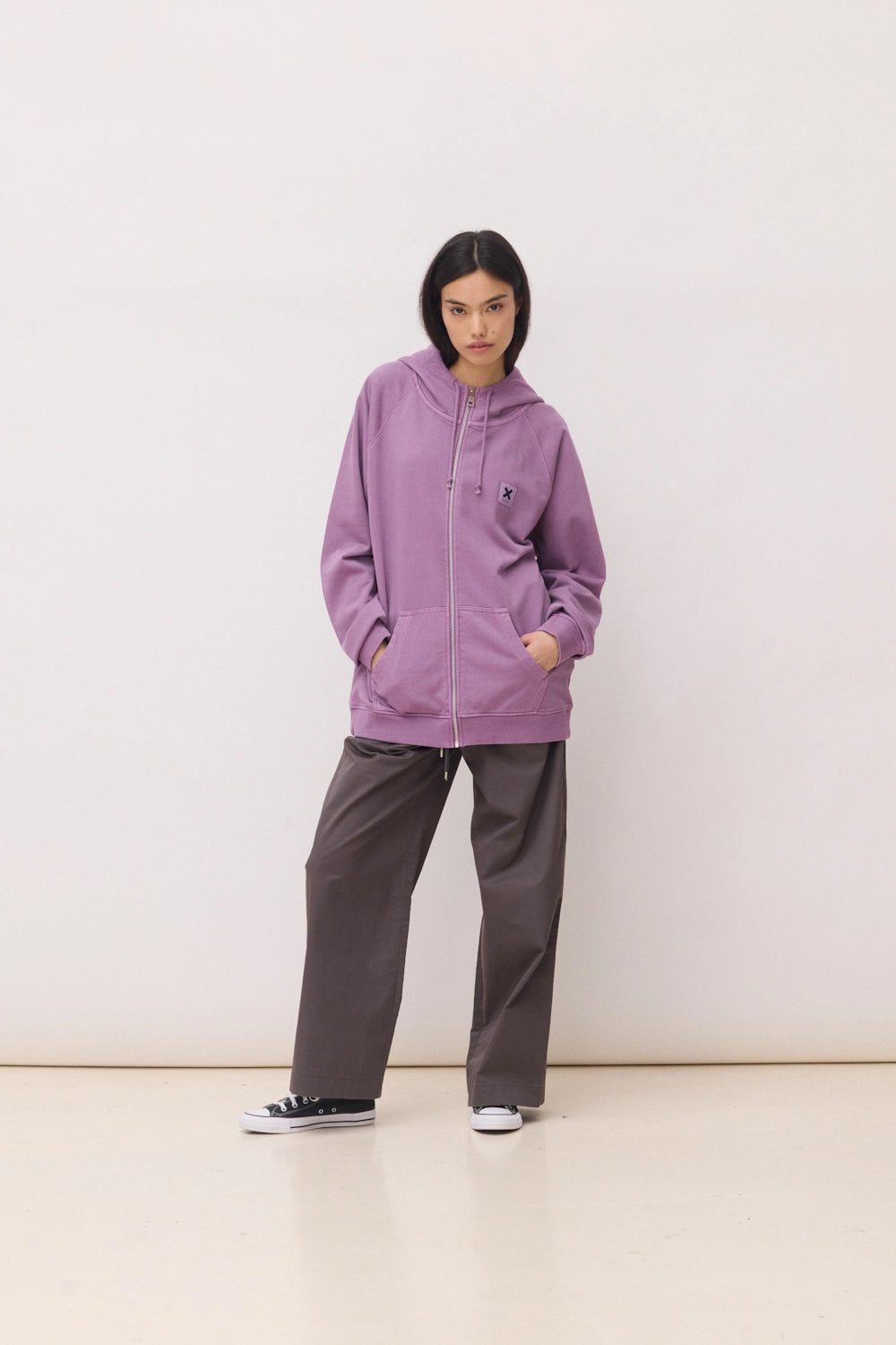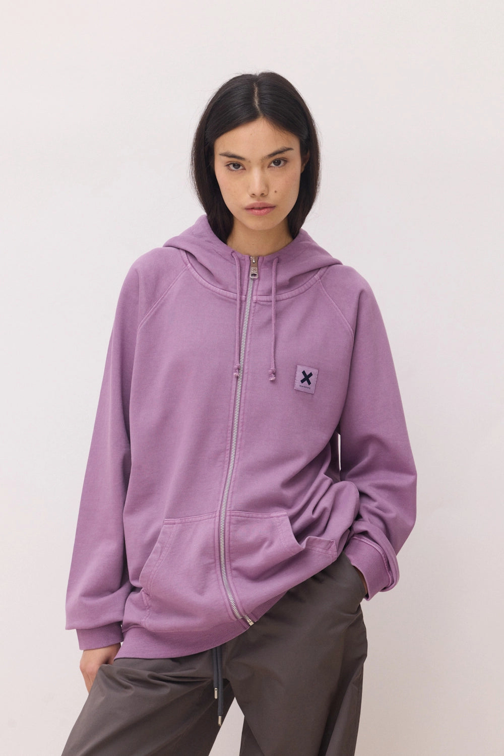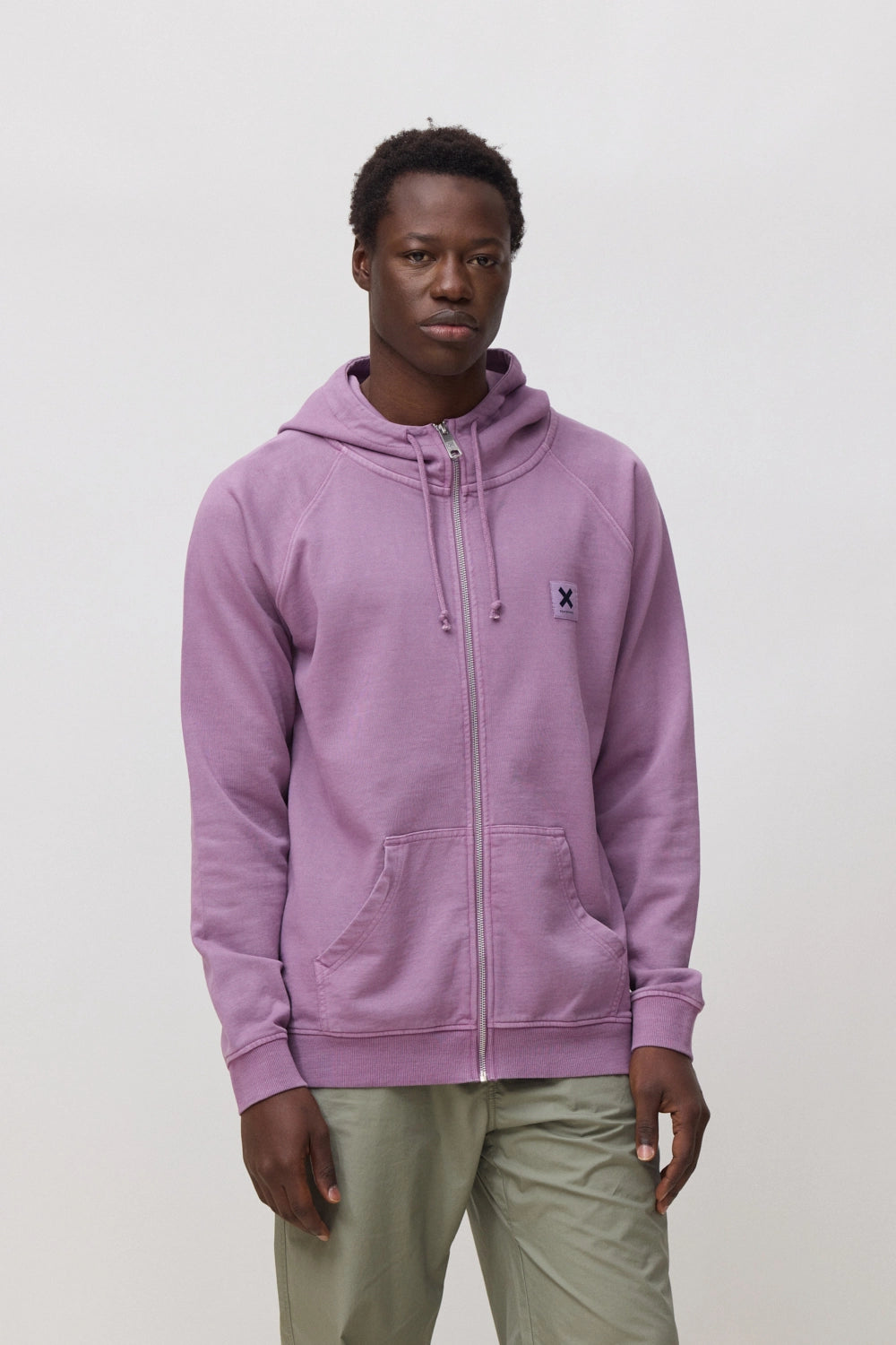 Sudadera efecto lavado con capucha con cremallera central. Logo en etiqueta tejida. Confeccionada con 100% algodón orgánico. Corte regular fit y gramaje: 400 GSM.