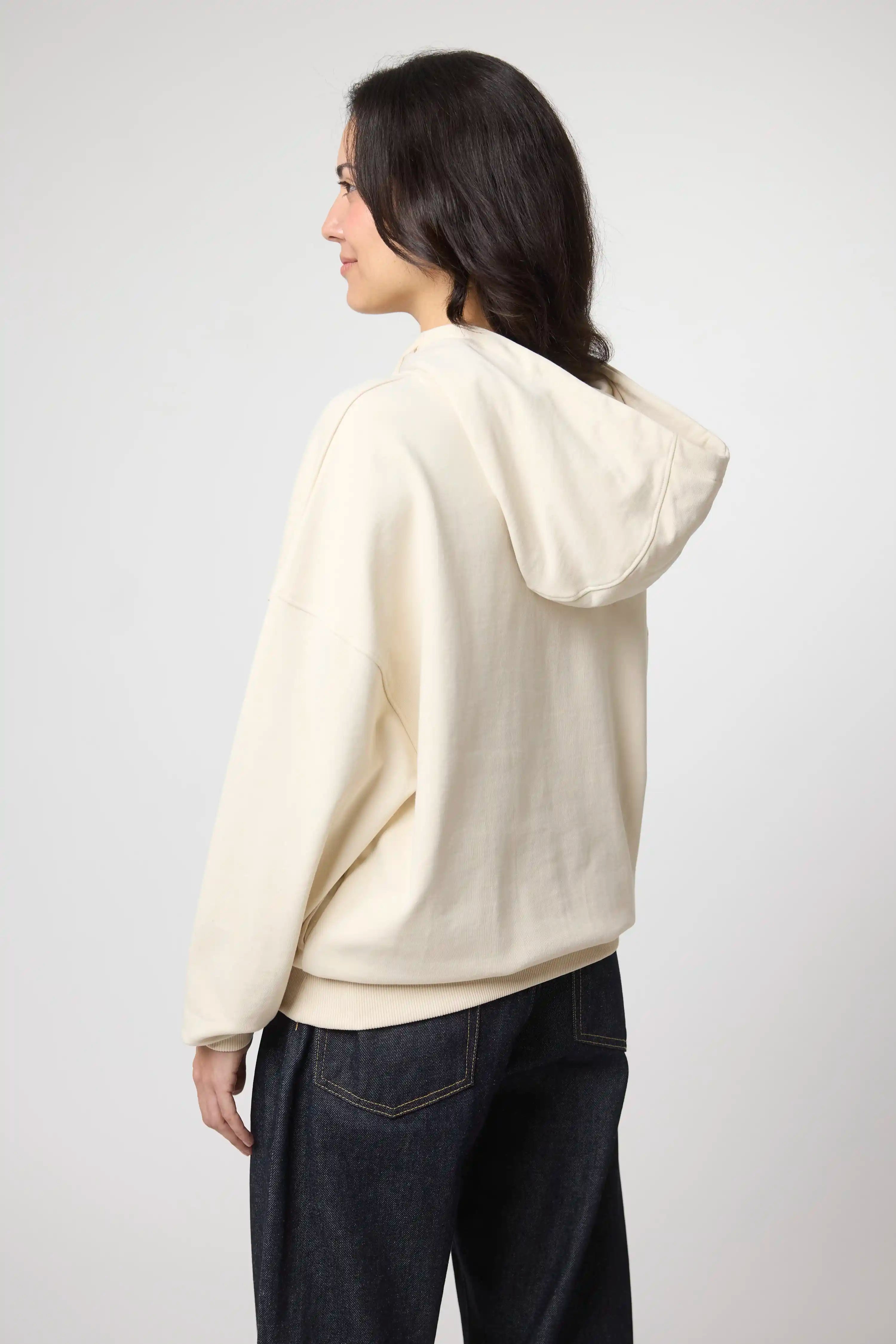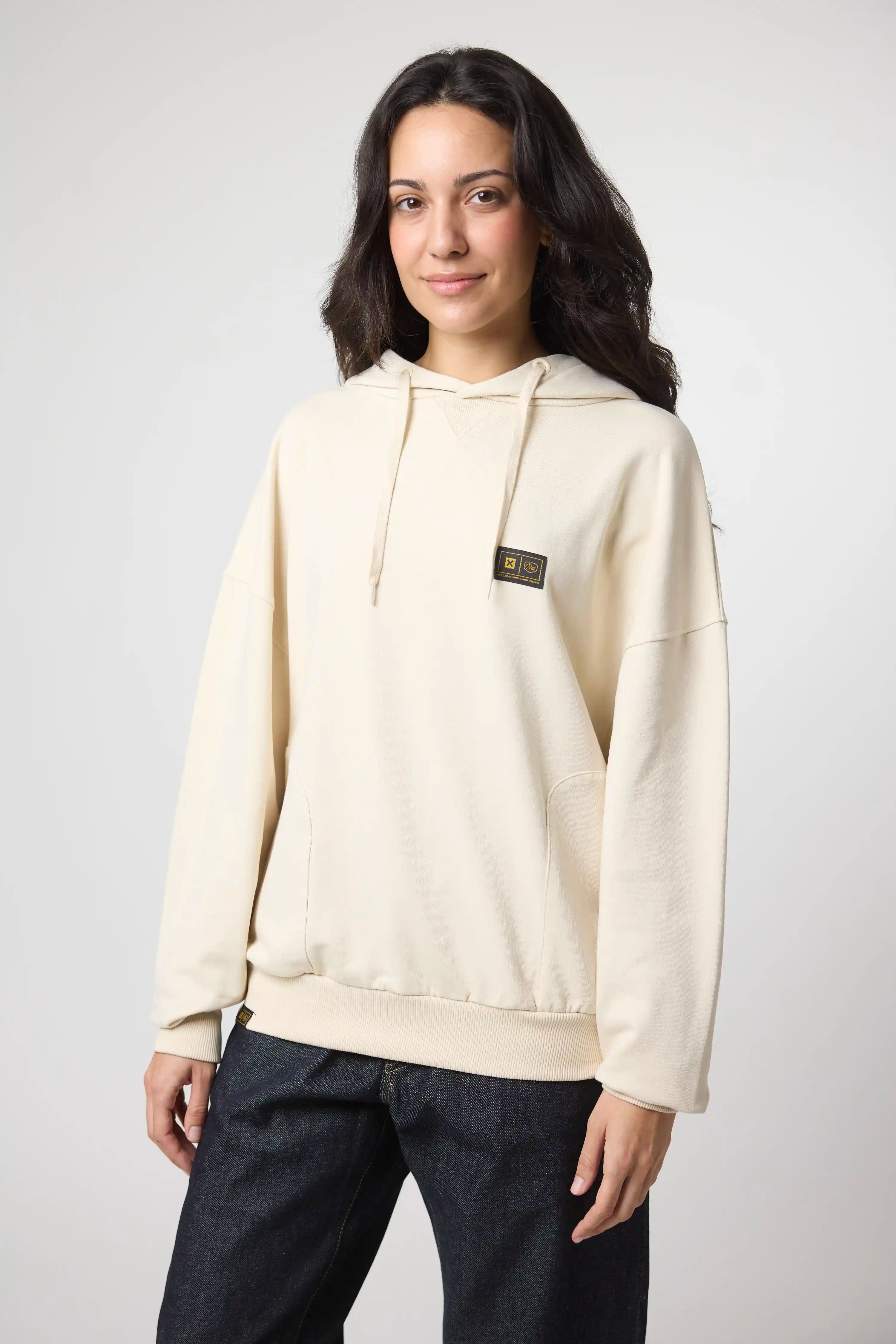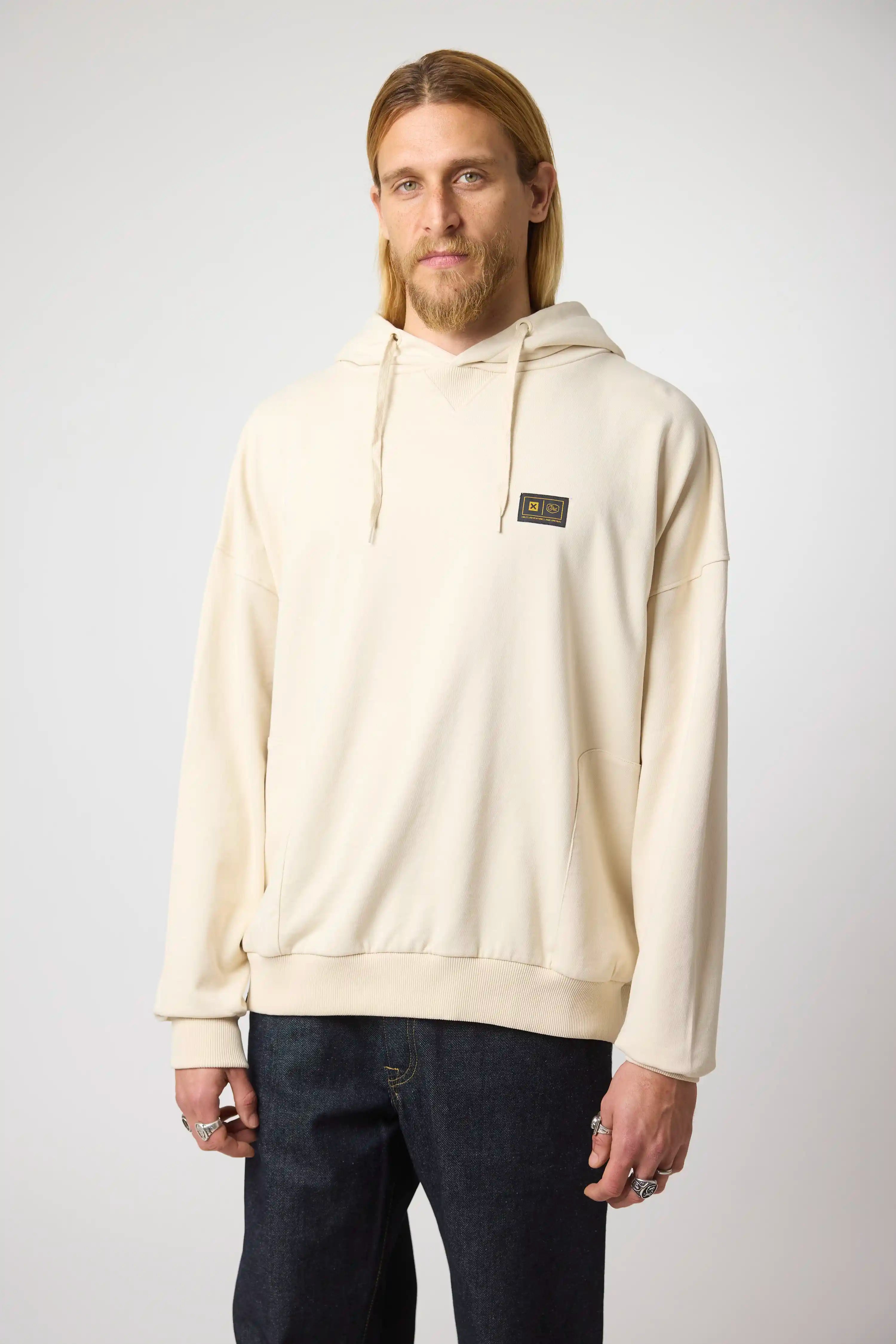 Hoodie with a decorative embroidered label on the upper left. Made from 100% organic cotton with side pockets. Boxy fit.