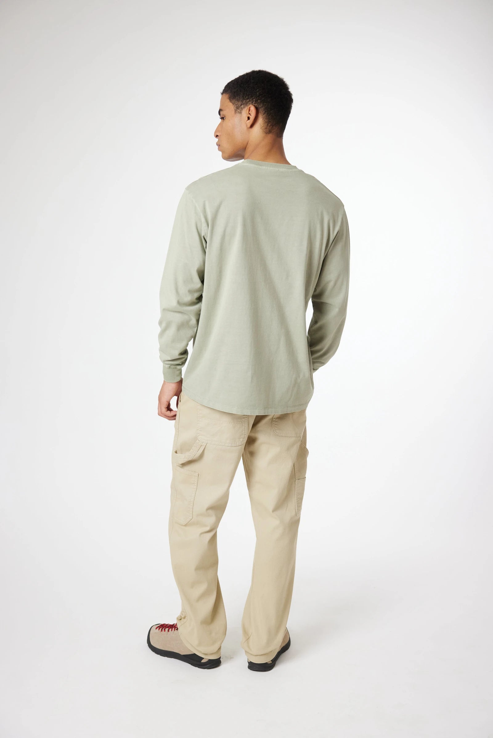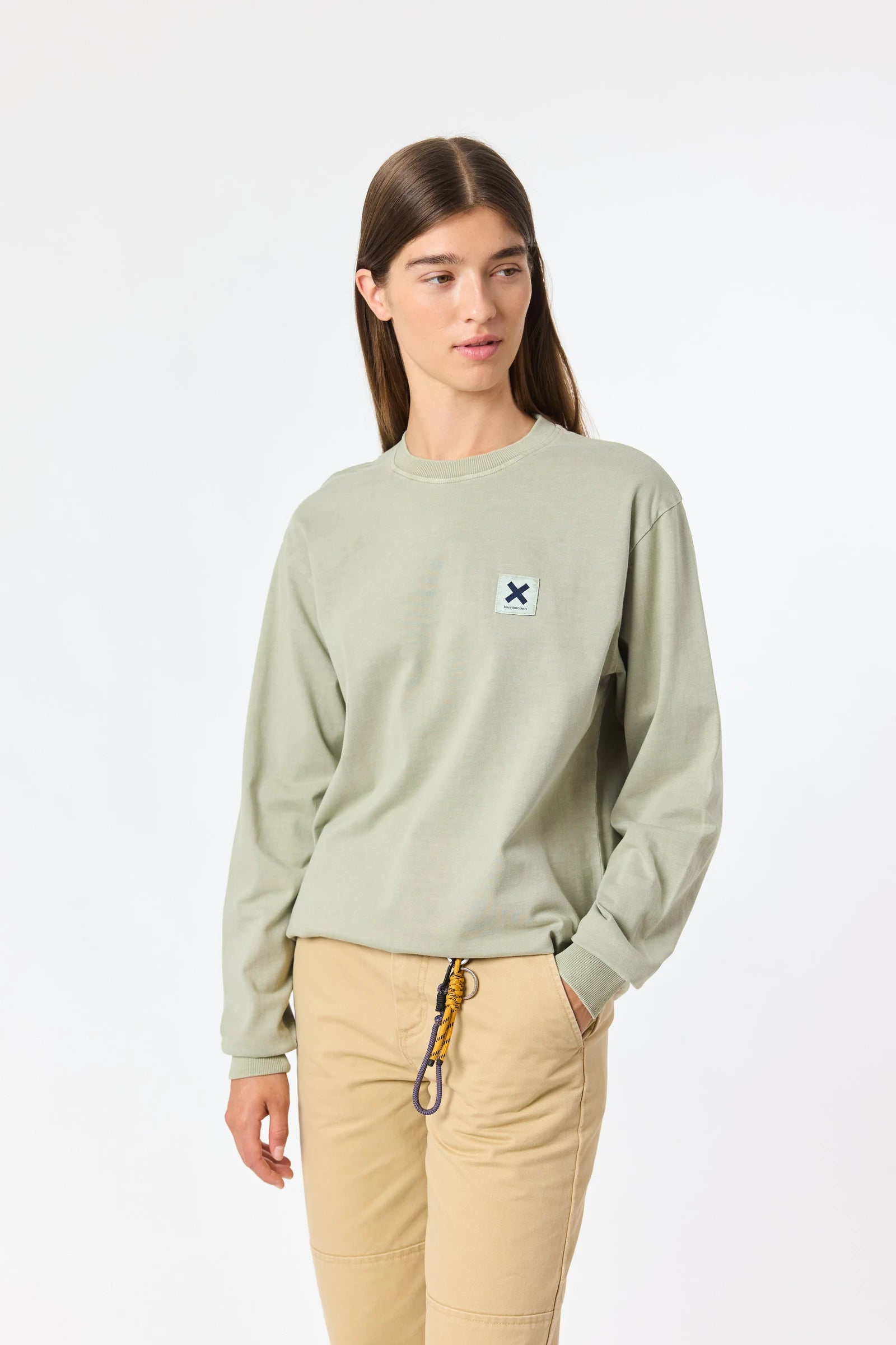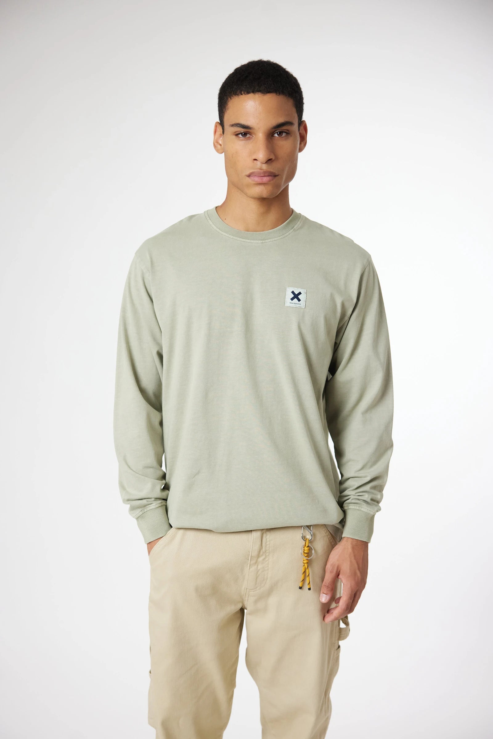 Long sleeve washed-effect t-shirt with a woven label logo on the chest.