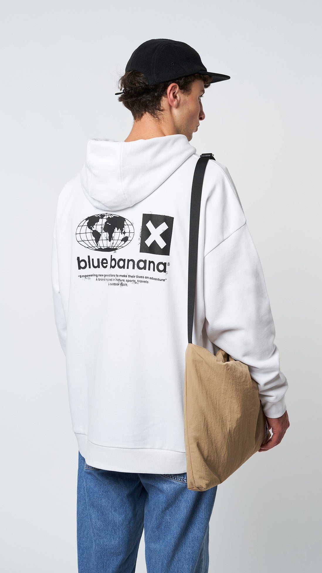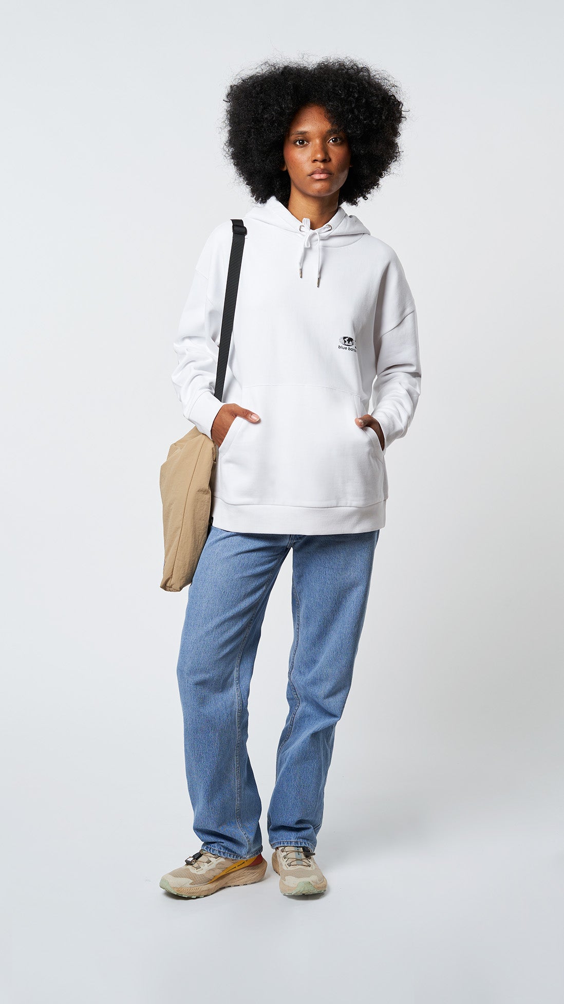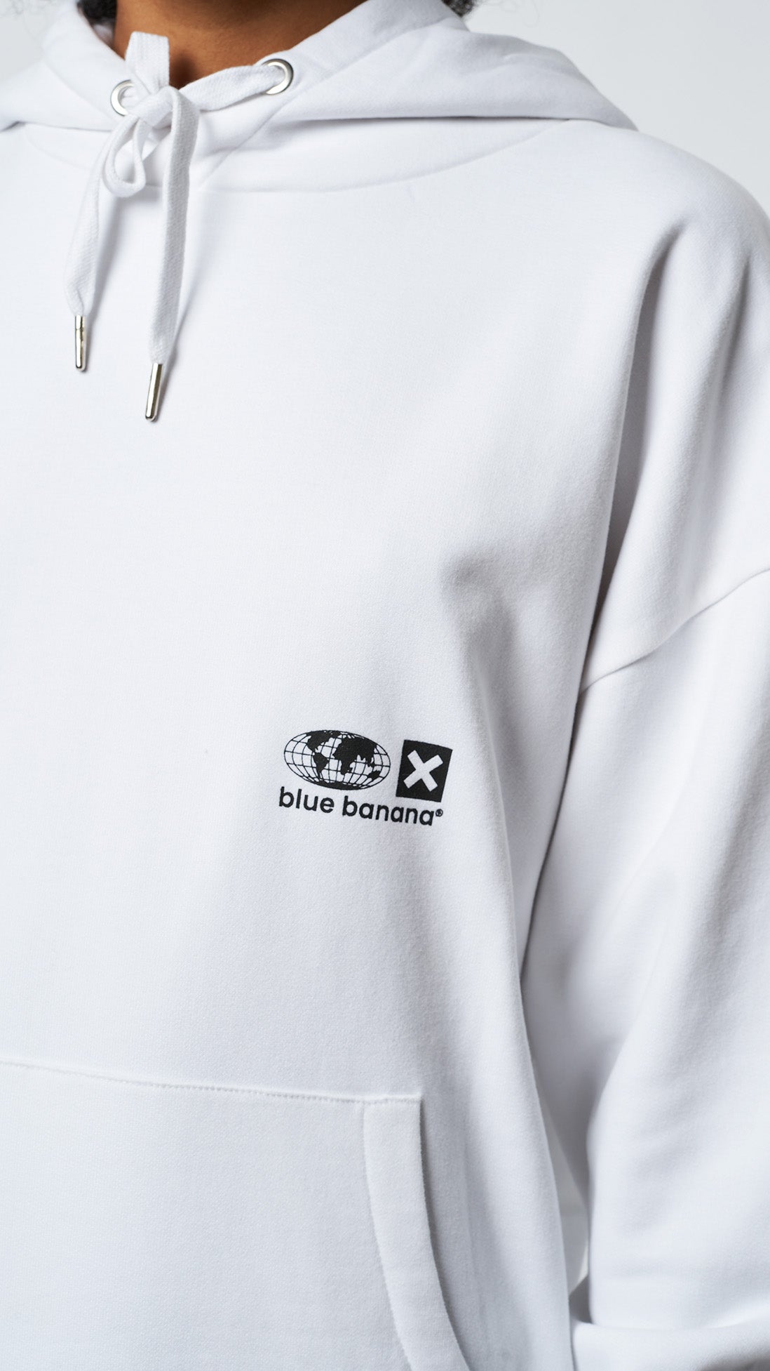 Hoodie with front print on the upper left side and central back print. Front central lower pocket with opening on both sides. Made of 100% organic cotton and oversized cut.