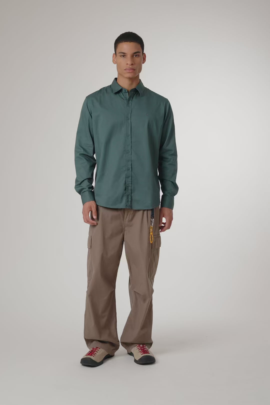 Camisa de manga comprida, 100% algodão. Motivo decorativo bordado no peito. Botões personalizados. Etiqueta de branding na carcela do punho.
