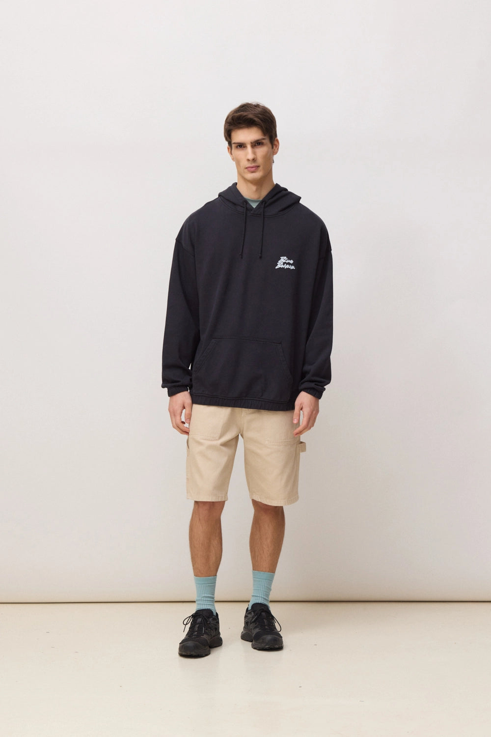 Sweatshirt com capuz com print frontal no lateral superior esquerdo e print traseiro central e corte oversize.