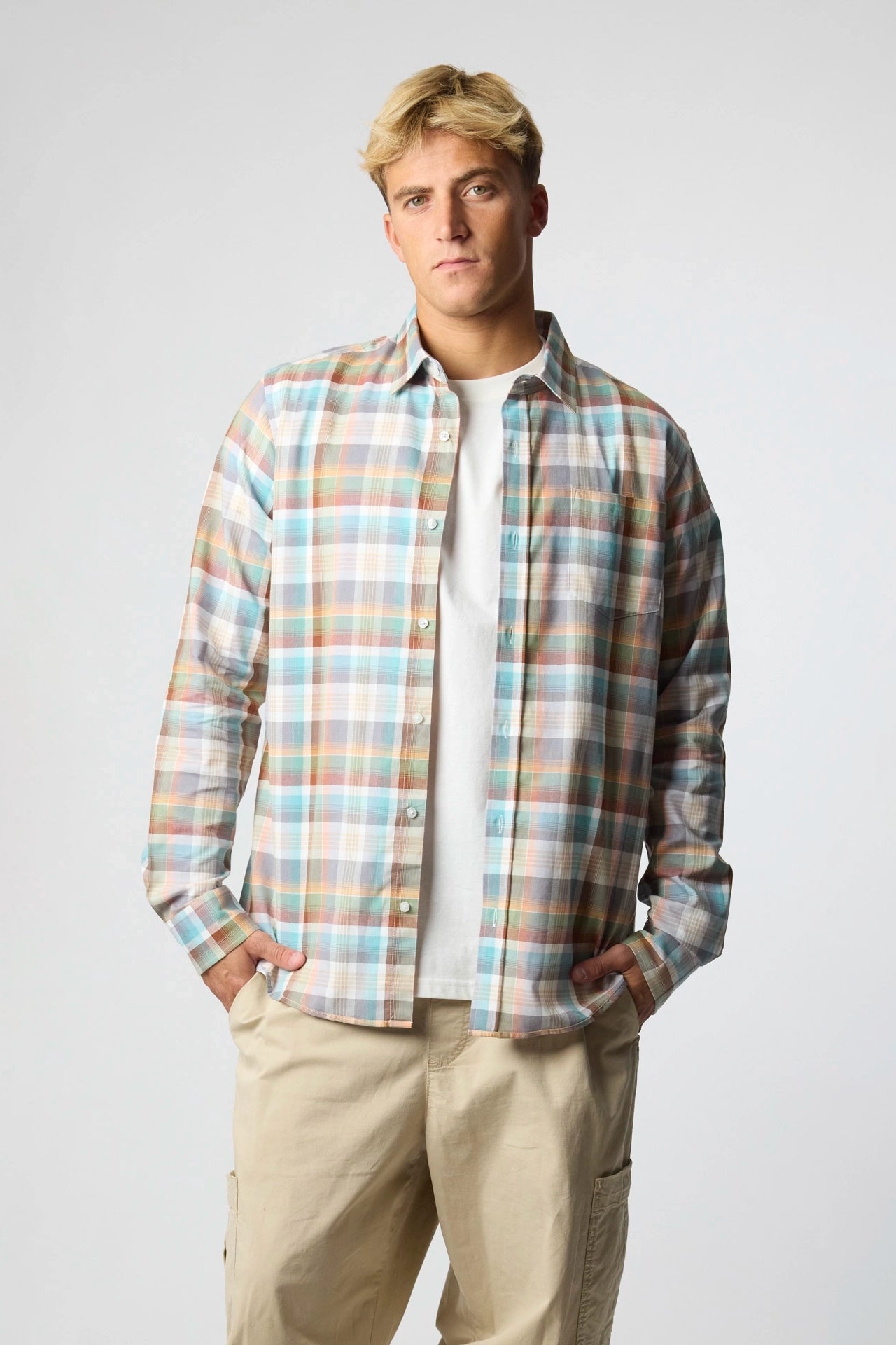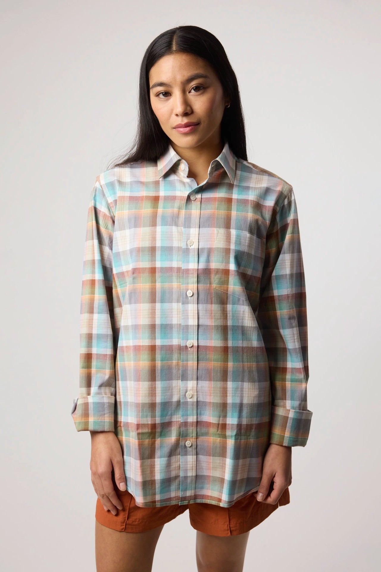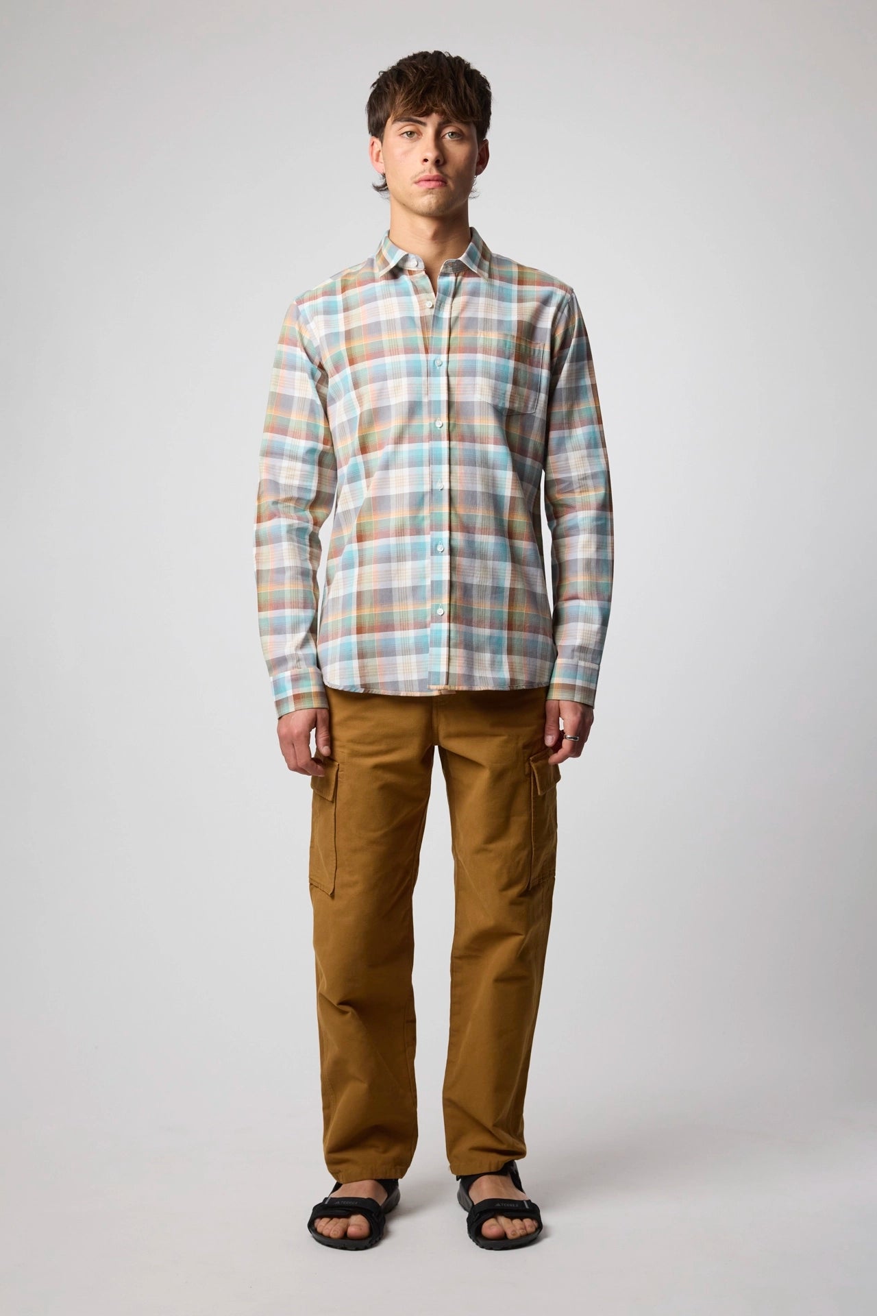 Camisa estampada de 100% algodão, com um bolso à frente do lado esquerdo. Etiqueta bordada na parte inferior esquerda. Botões personalizados.