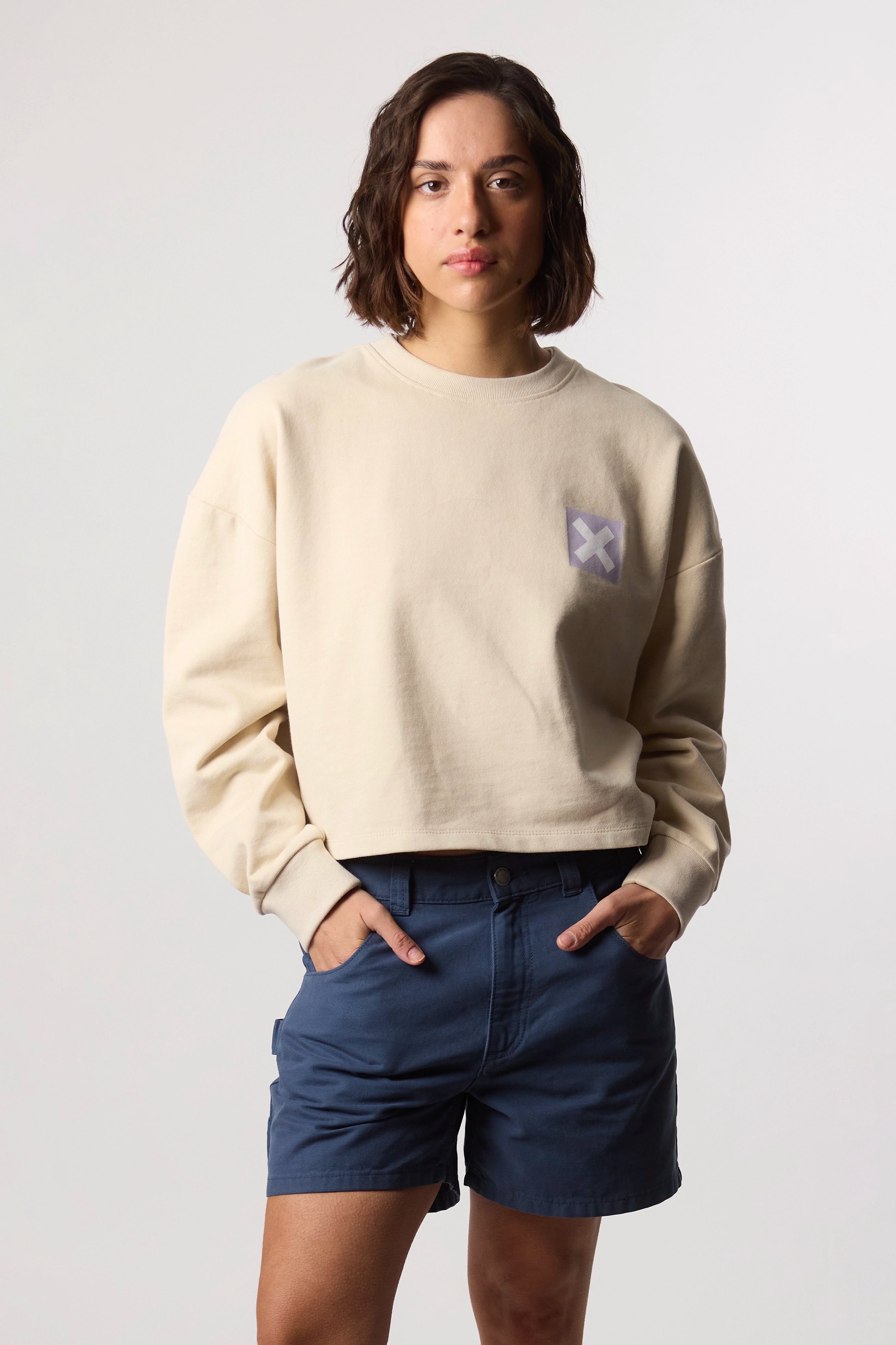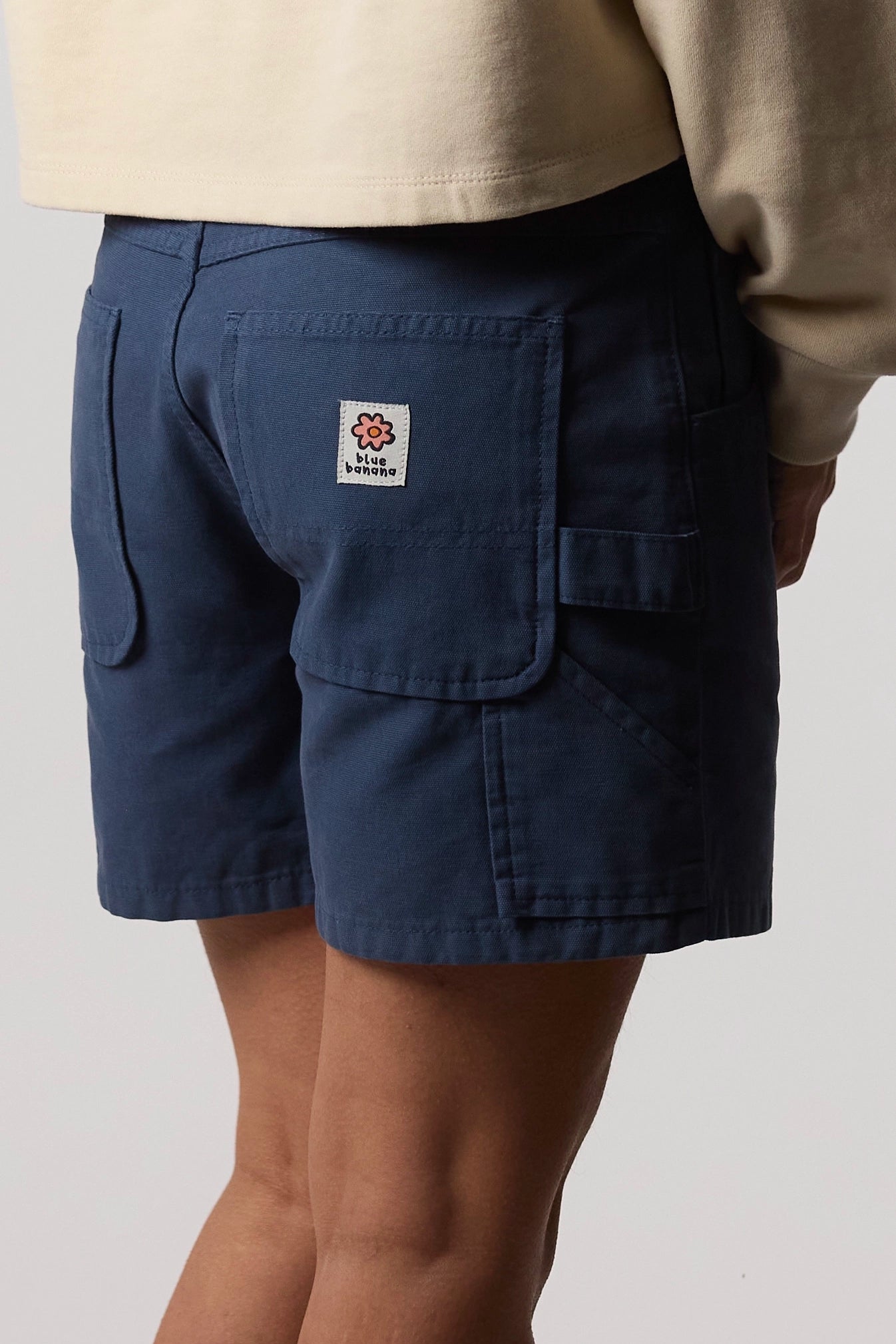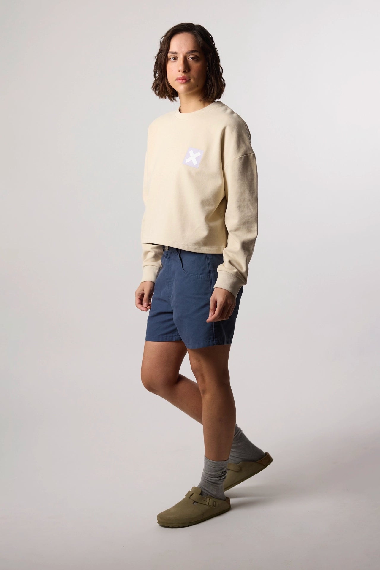 Bermuda 100% algodão orgânico com caimento regular, bolsos e fecho personalizado.