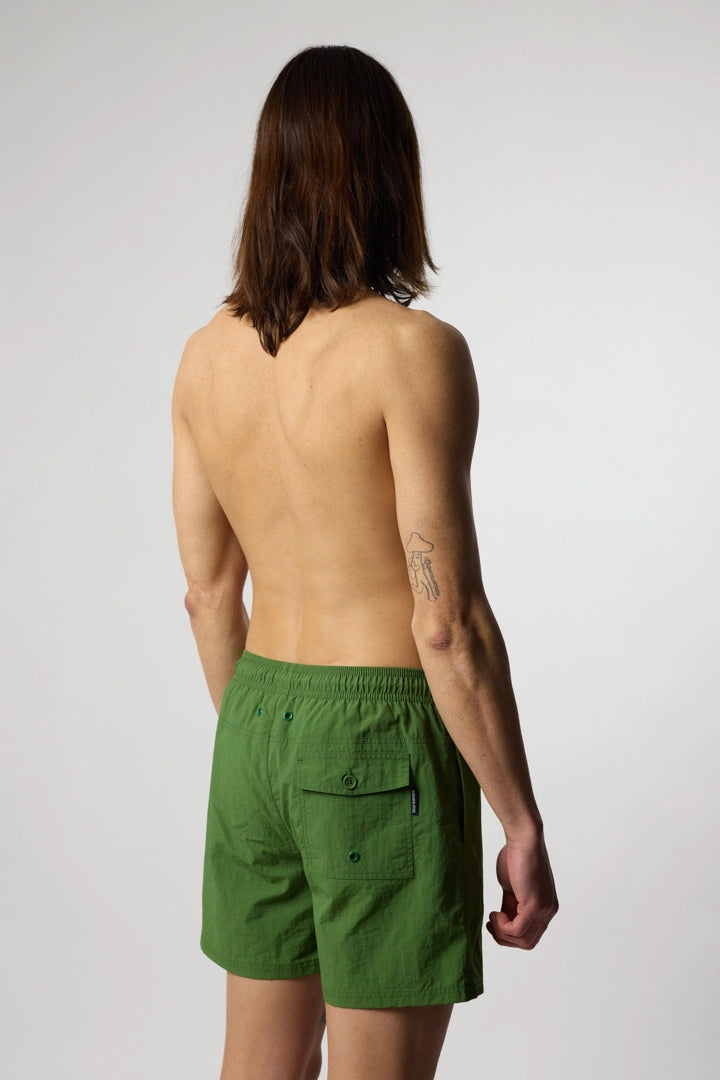 Fato de banho com corte reto. Cintura elástica, fecho com cordão e ilhós emborrachados. Etiqueta cosida na parte inferior direita. Bolsos laterais na frente e bolso traseiro na parte superior direita com aba para fecho e ilhós metálico.