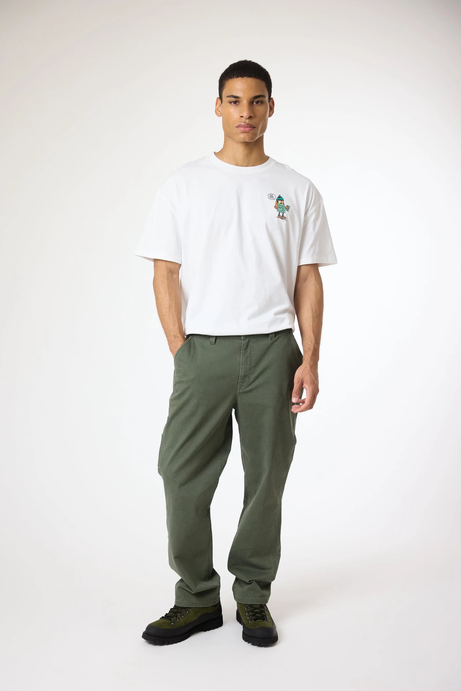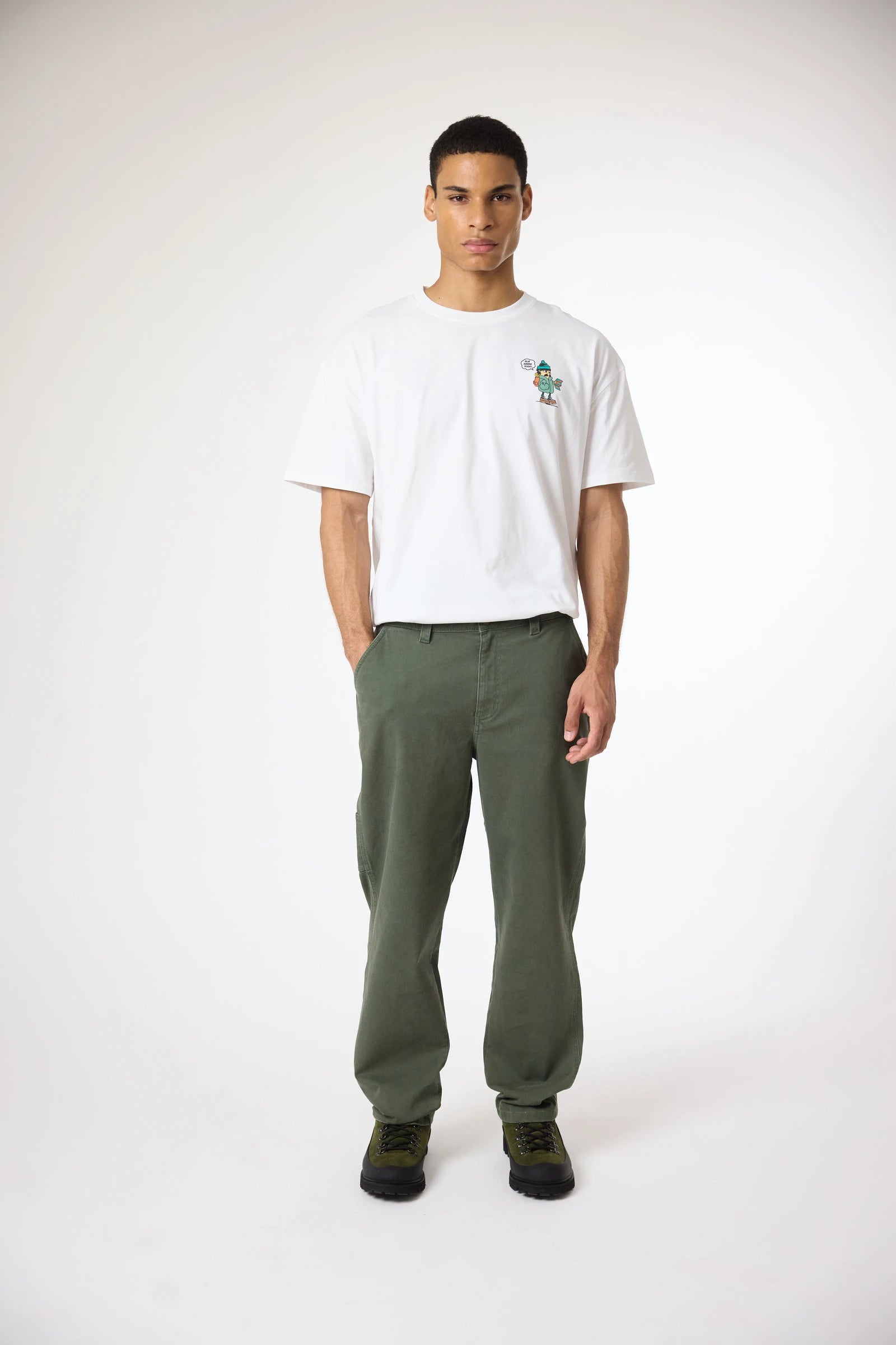Calças chino fabricadas em tecido sarja, em algodão elastano. Com bolsos frontais e dois bolsos traseiros, com etiqueta decorativa de branding. Aba decorativa traseira na cintura.
