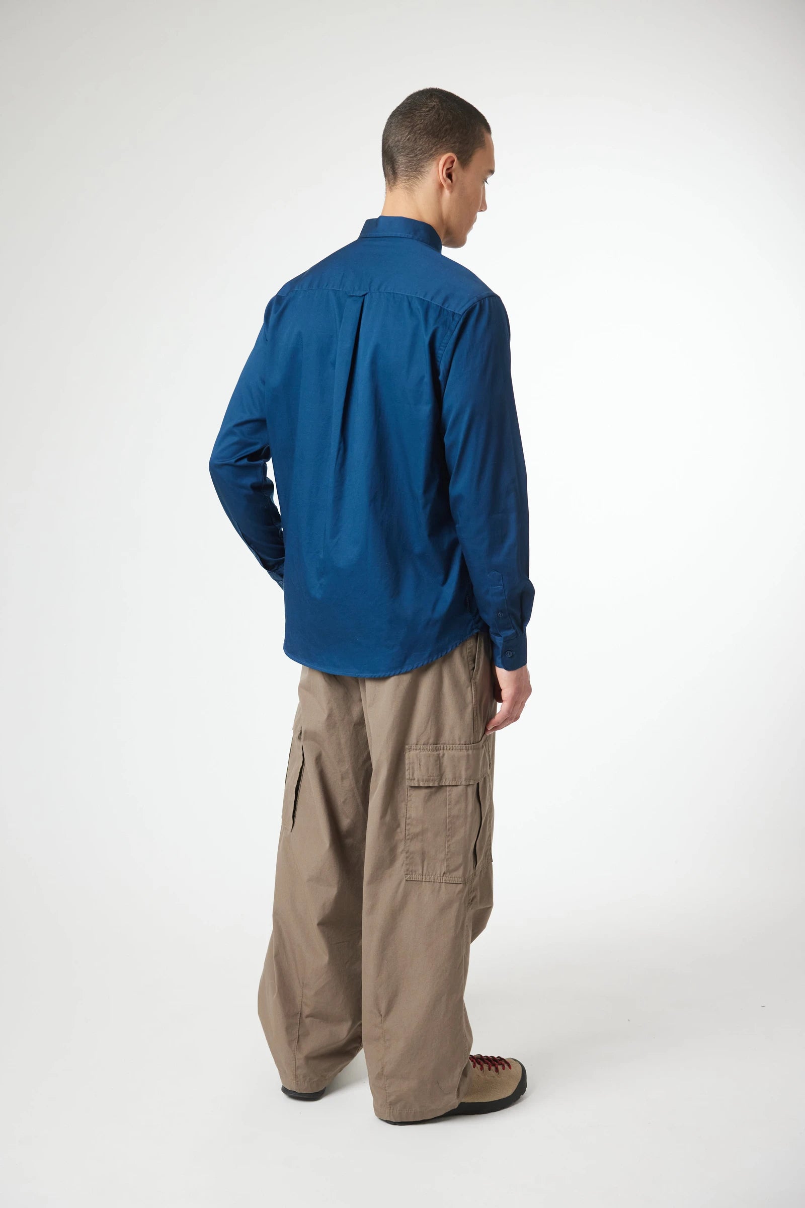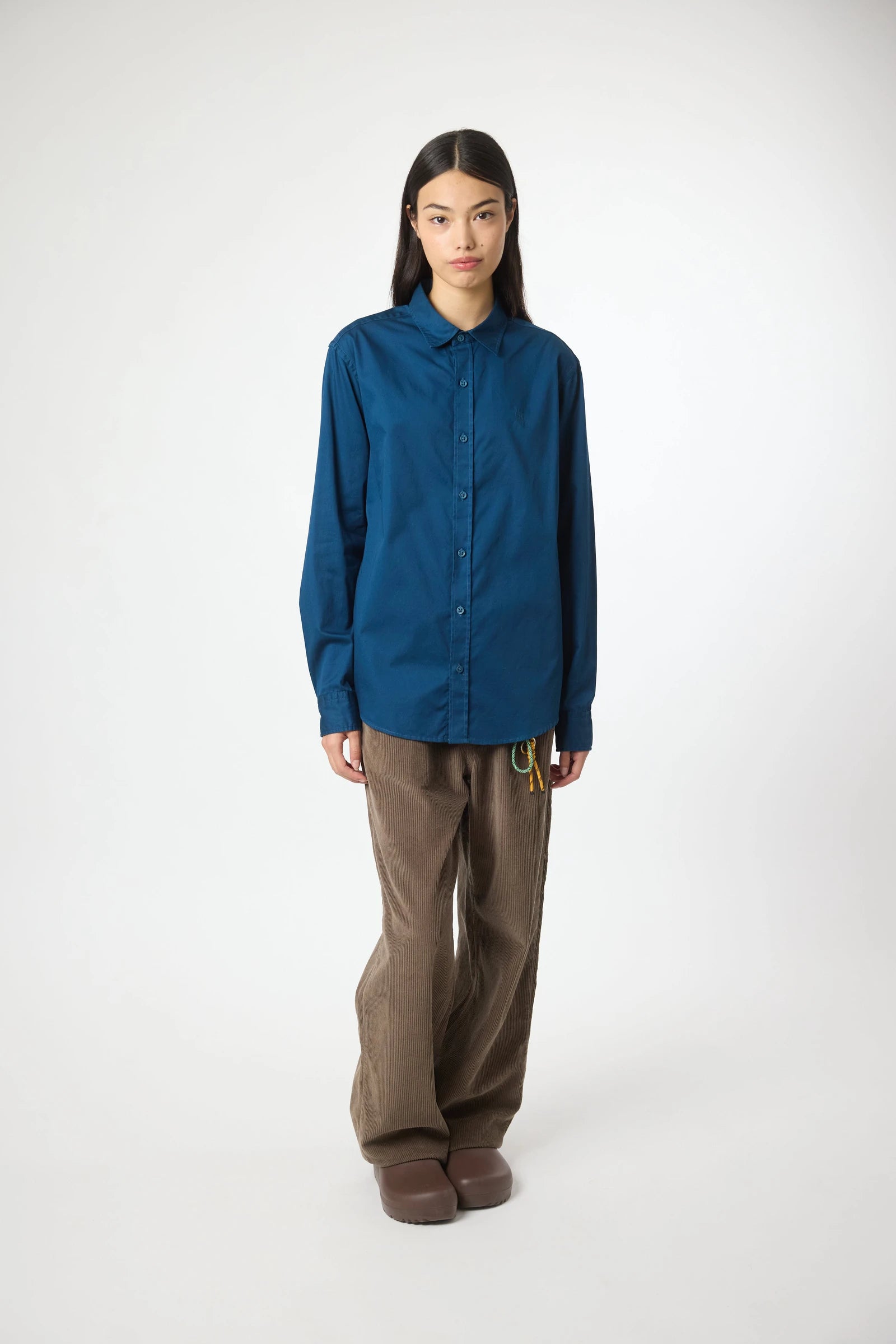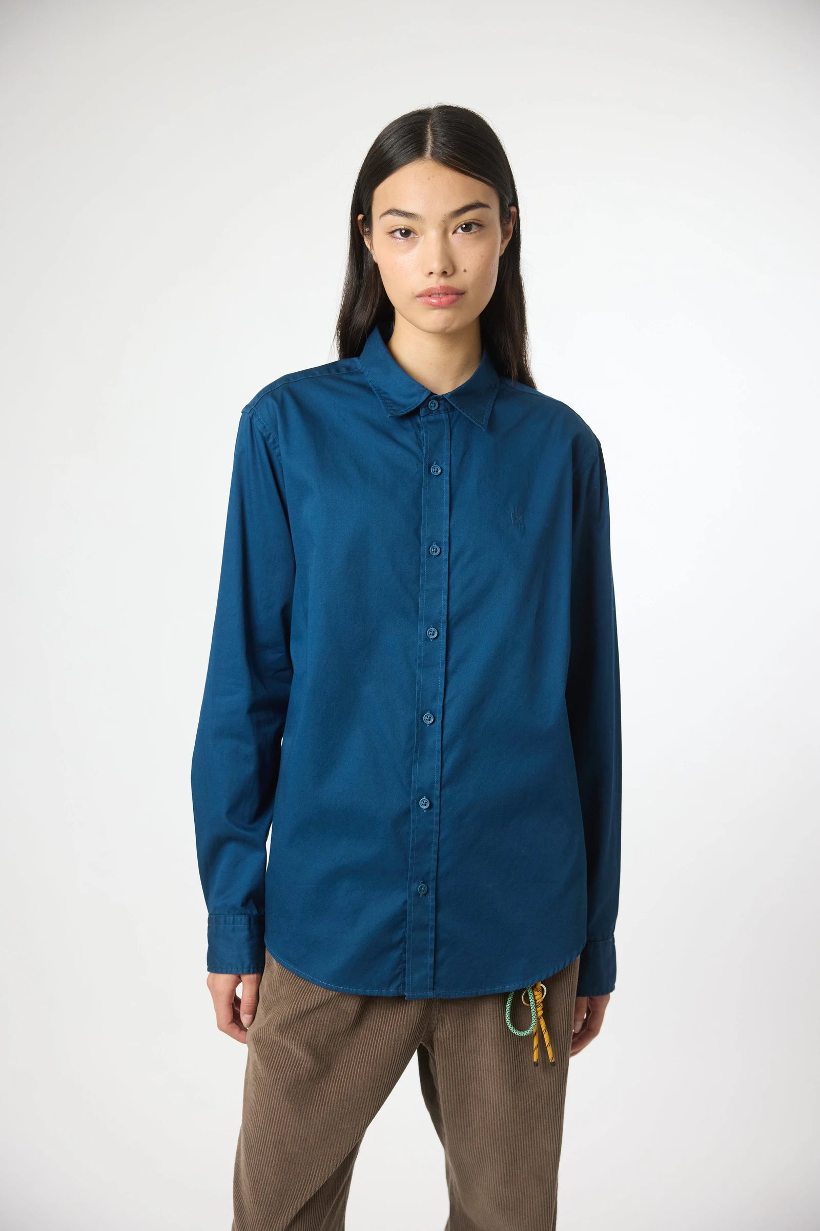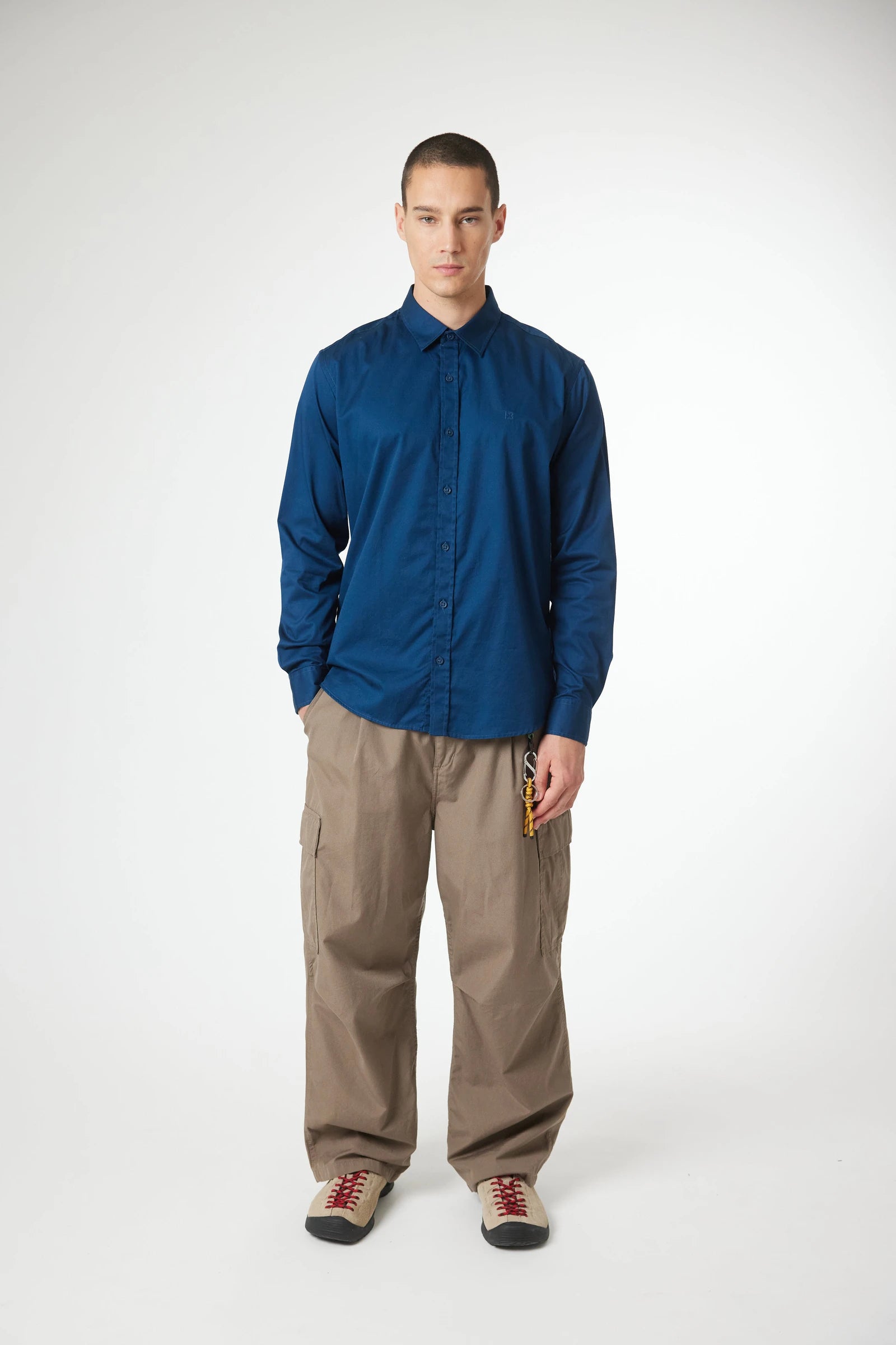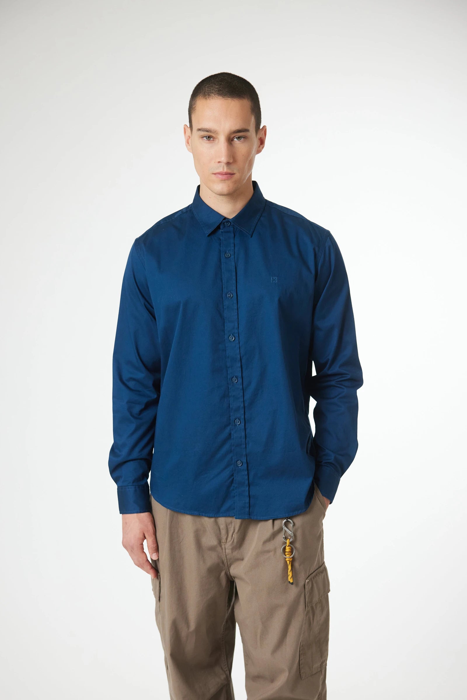 Camisa de manga comprida, 100% algodão. Motivo decorativo bordado no peito. Botões personalizados. Etiqueta de branding na carcela do punho.