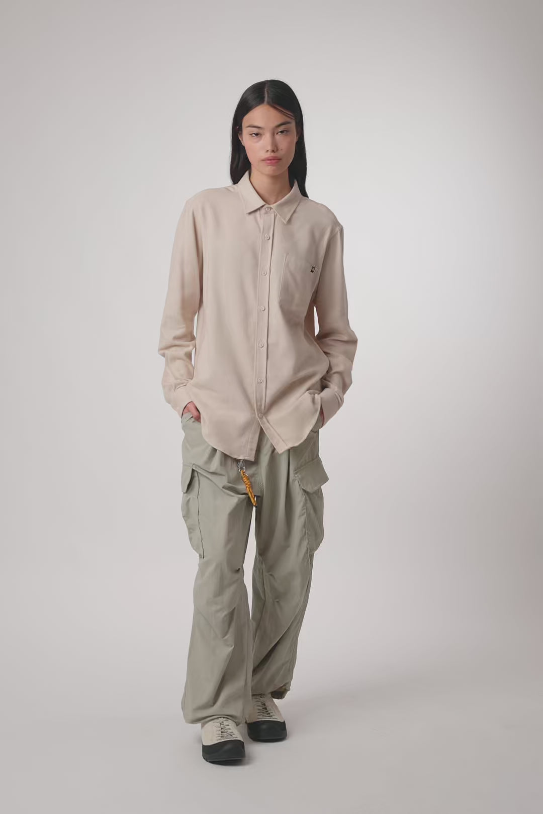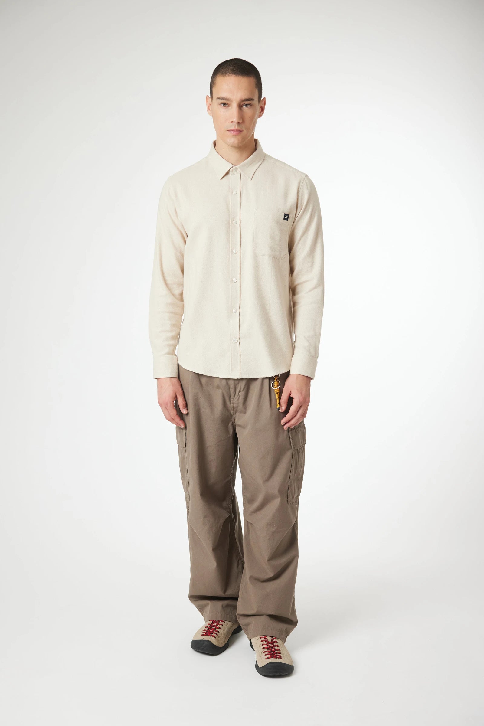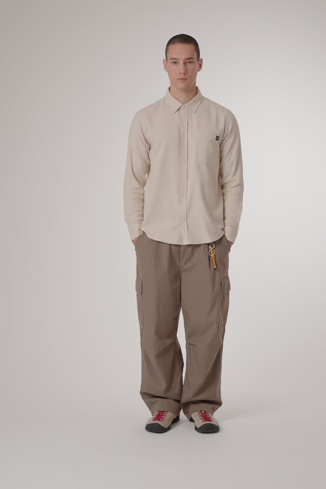 Camisa de manga comprida, 100% algodão. Um bolso de chapa no peito. Ombro avançado. Botões personalizados. Etiquetas de branding no bolso frontal e na costura lateral.