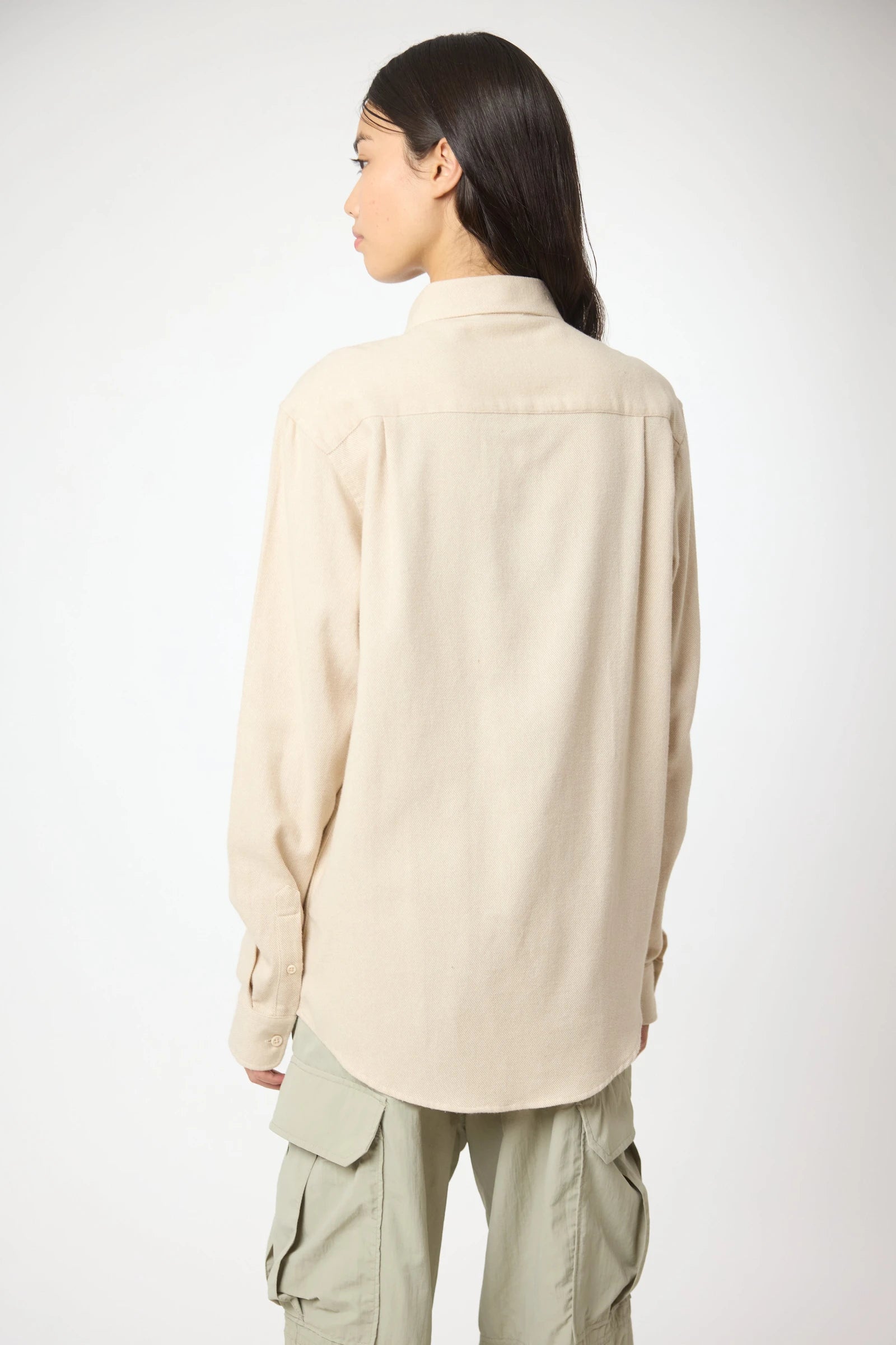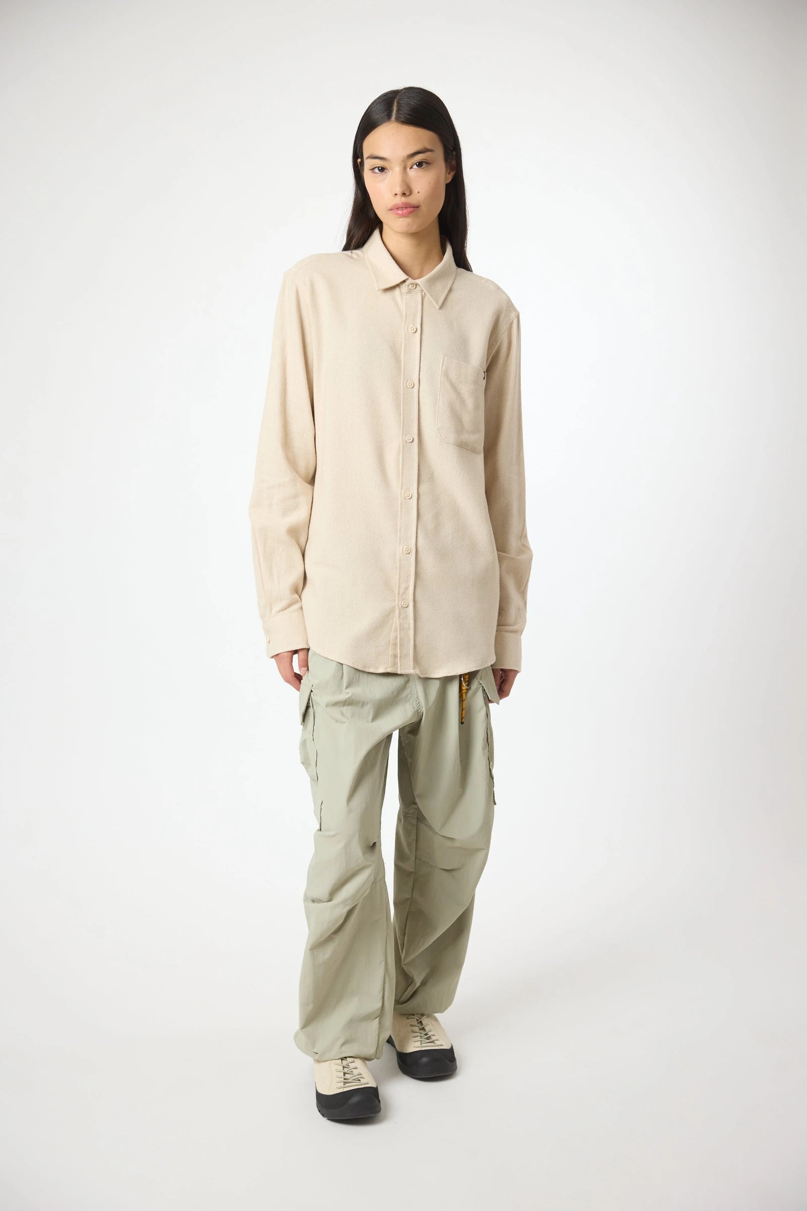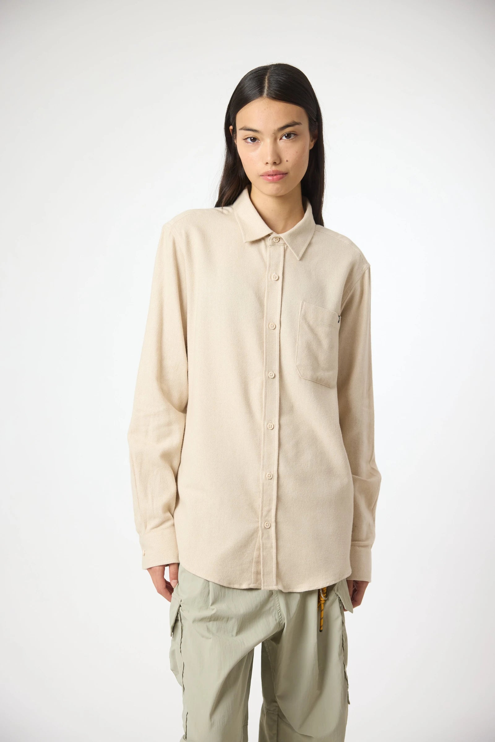 Camisa de manga comprida, 100% algodão. Um bolso de chapa no peito. Ombro avançado. Botões personalizados. Etiquetas de branding no bolso frontal e na costura lateral.