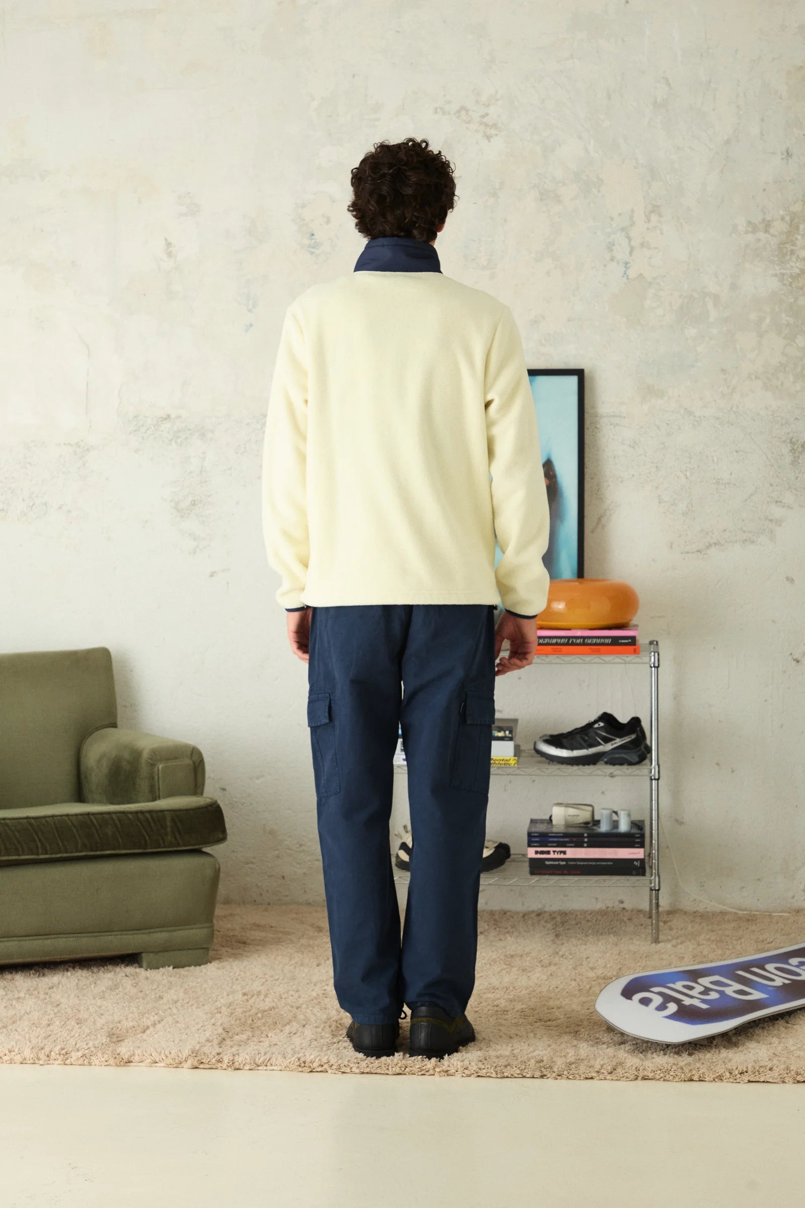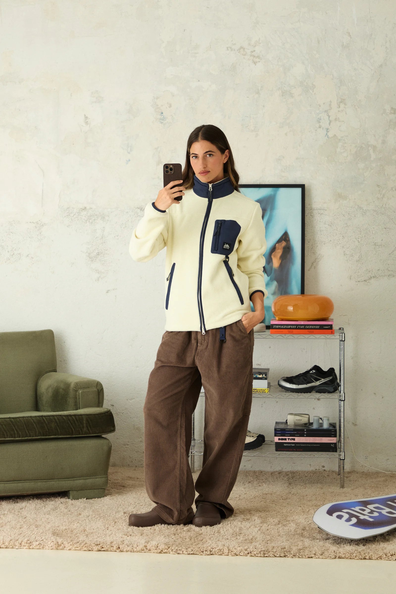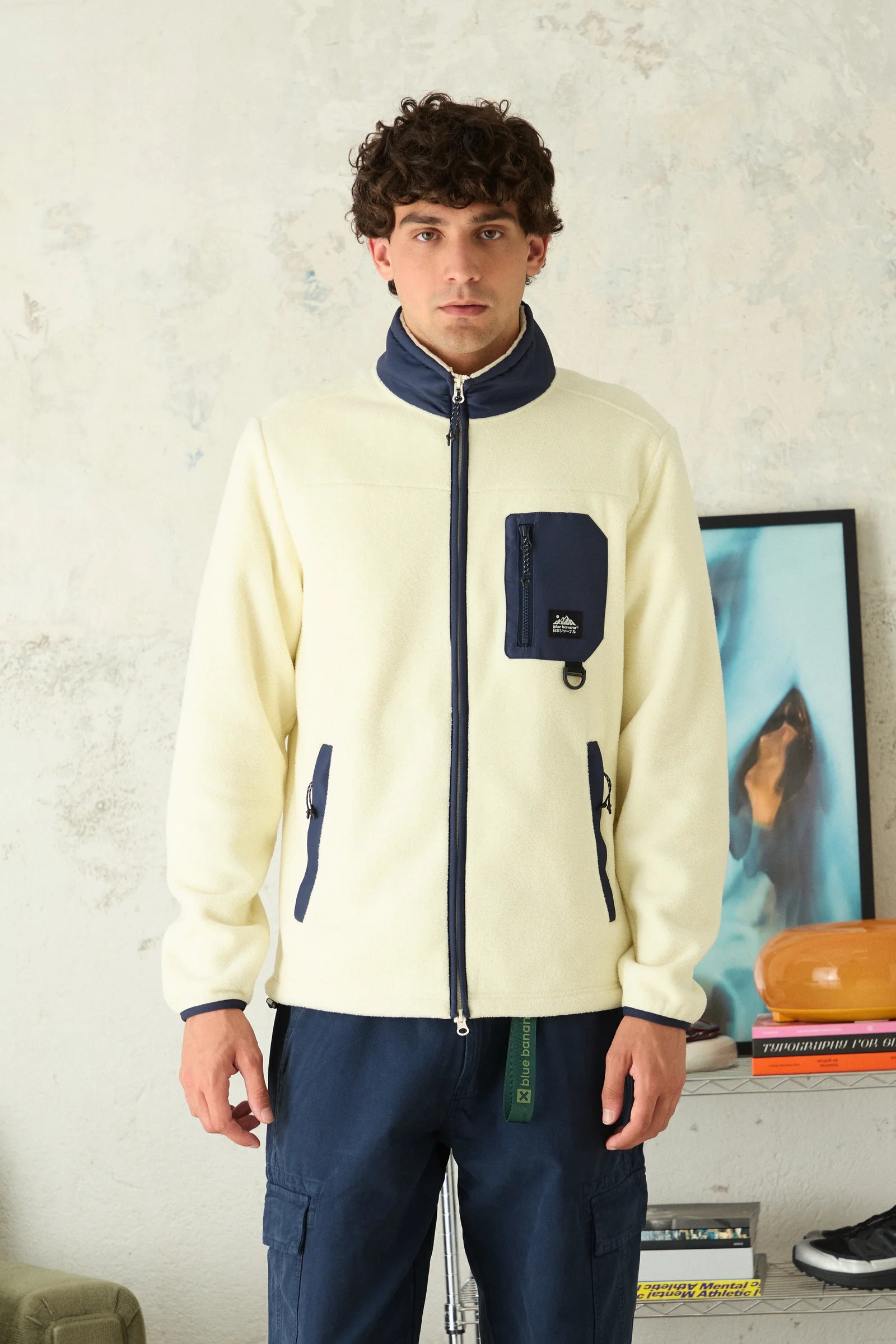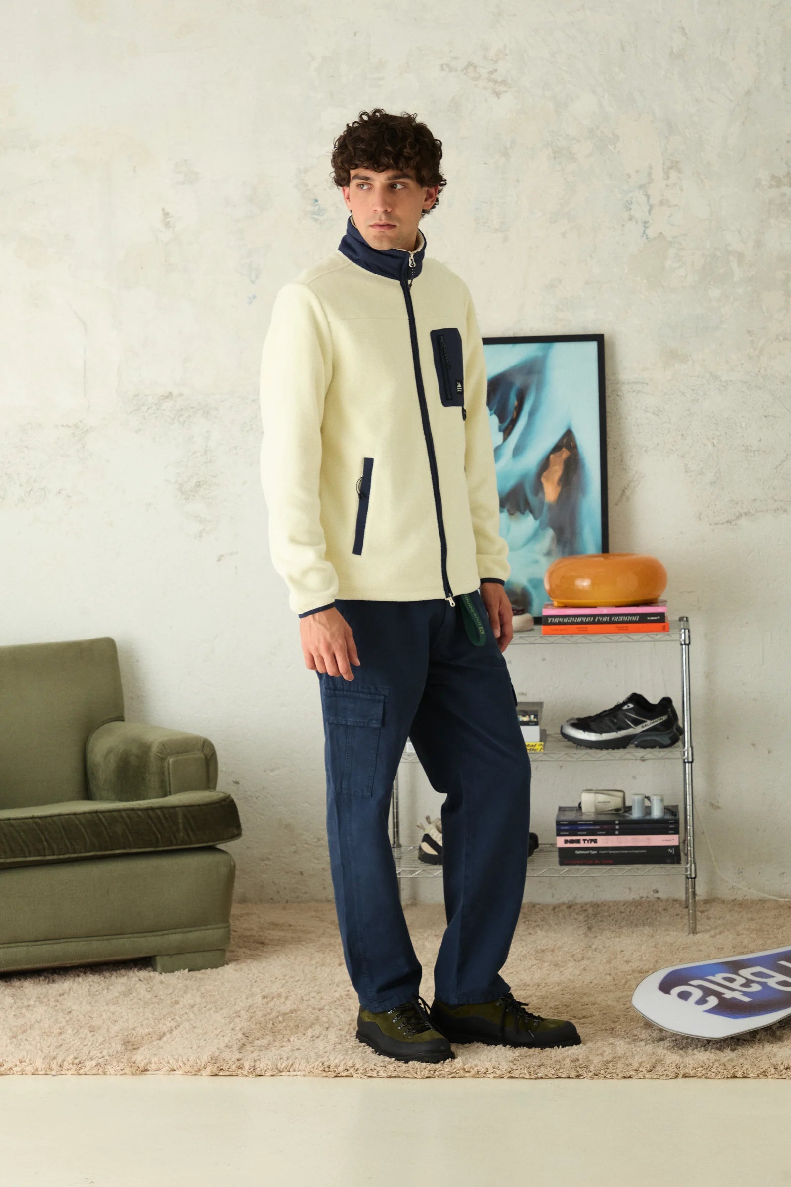 - Bolso em tecido contrastante no peito, com fecho de correr e etiqueta decorativa