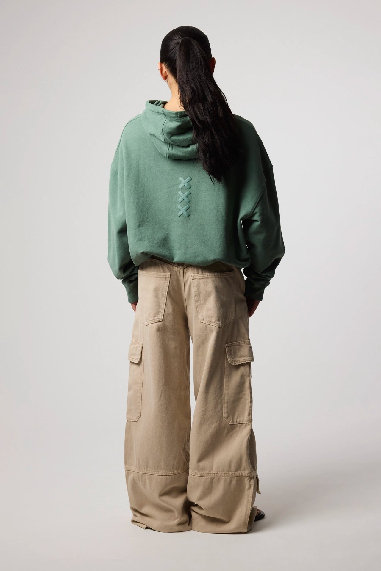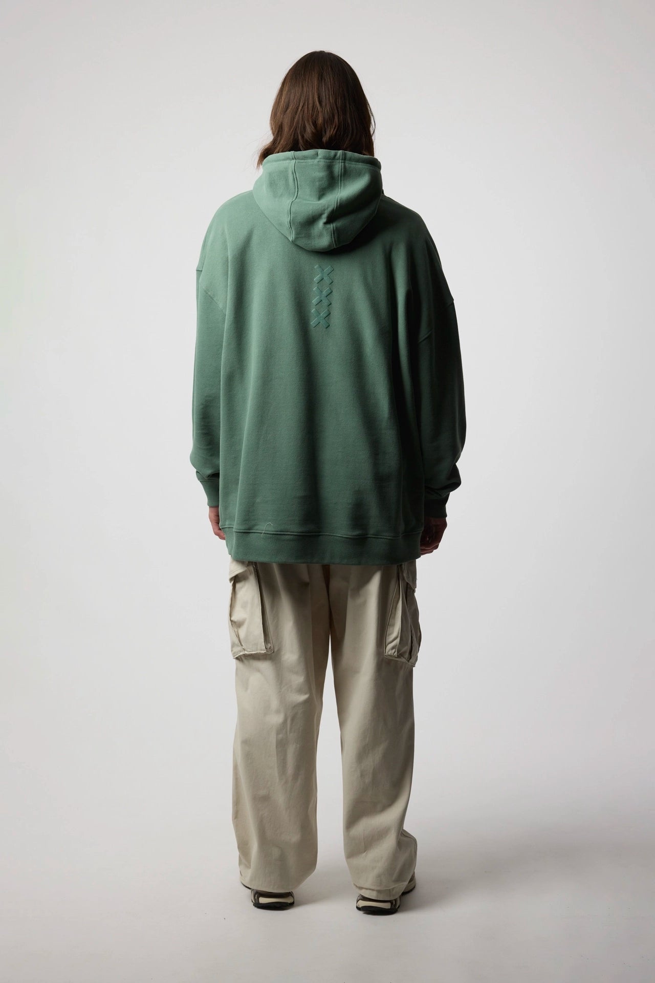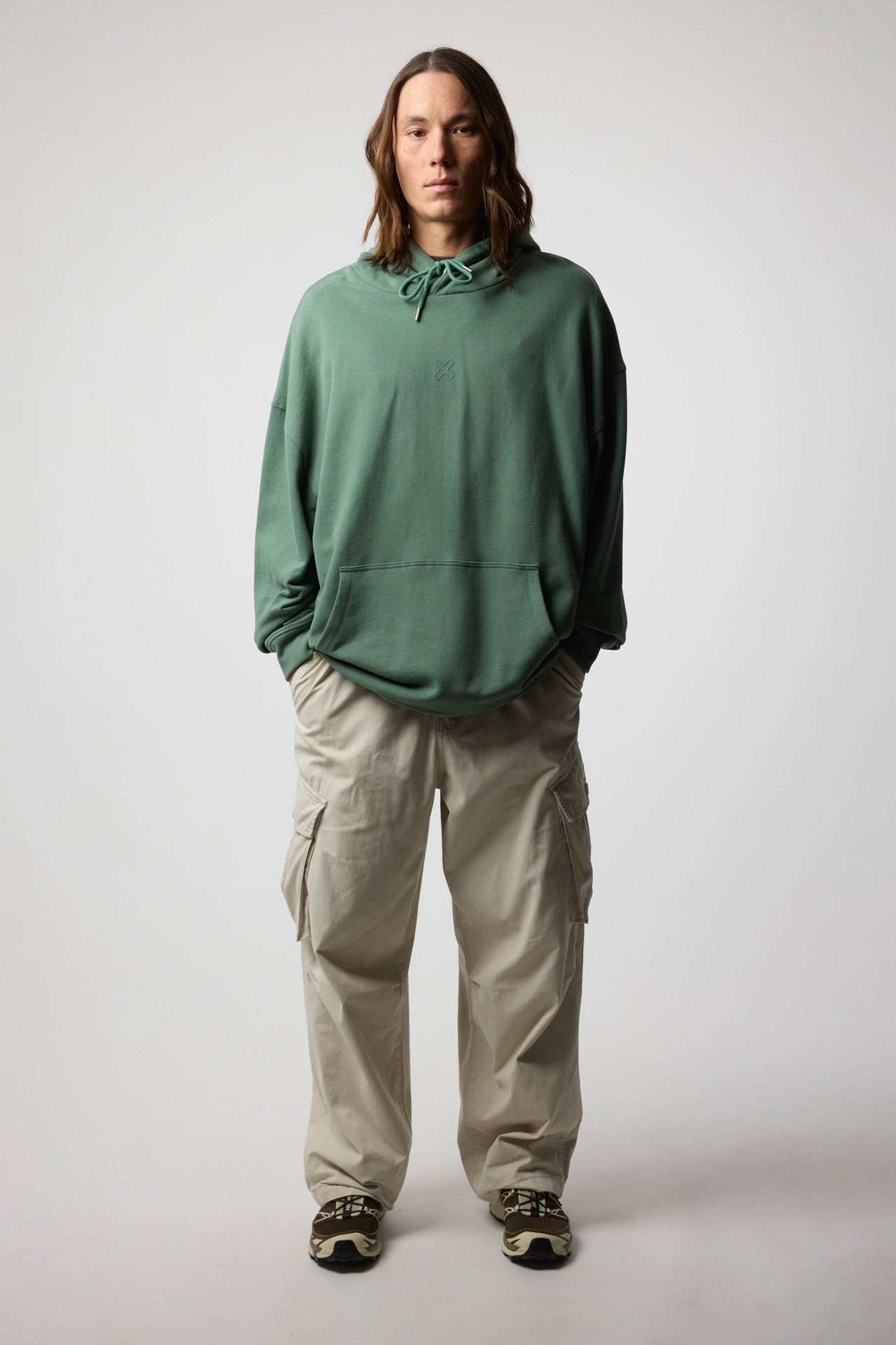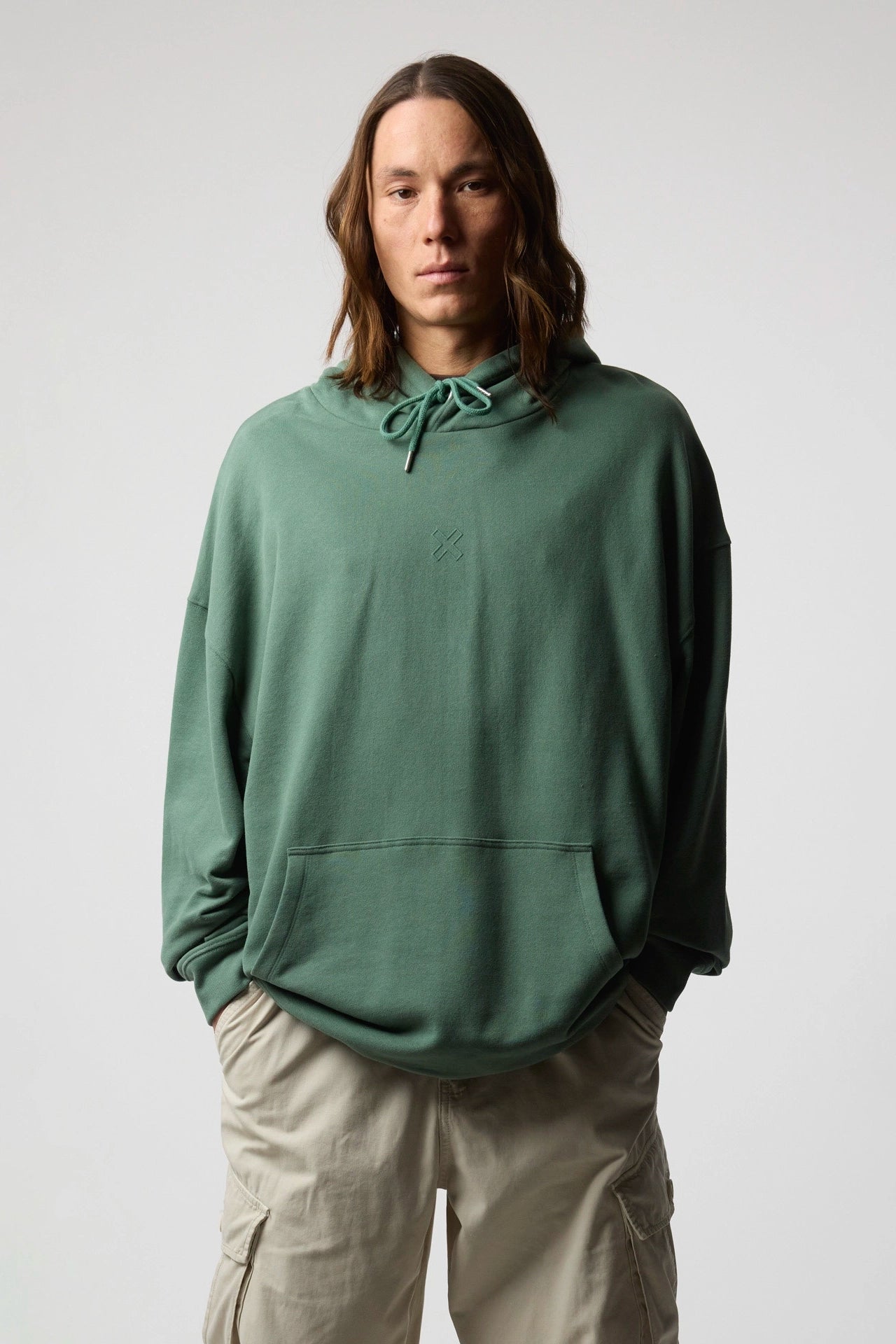 Hoodie com estampado no peito e nas costas. Confecionado em algodão 100% orgânico e com bolso aplicado à frente. Sem cardar para um efeito mais estival. Corte oversize.