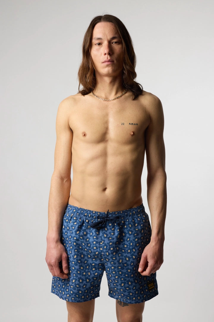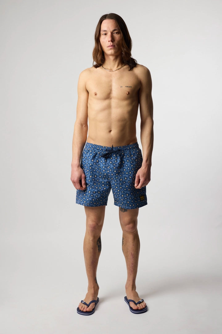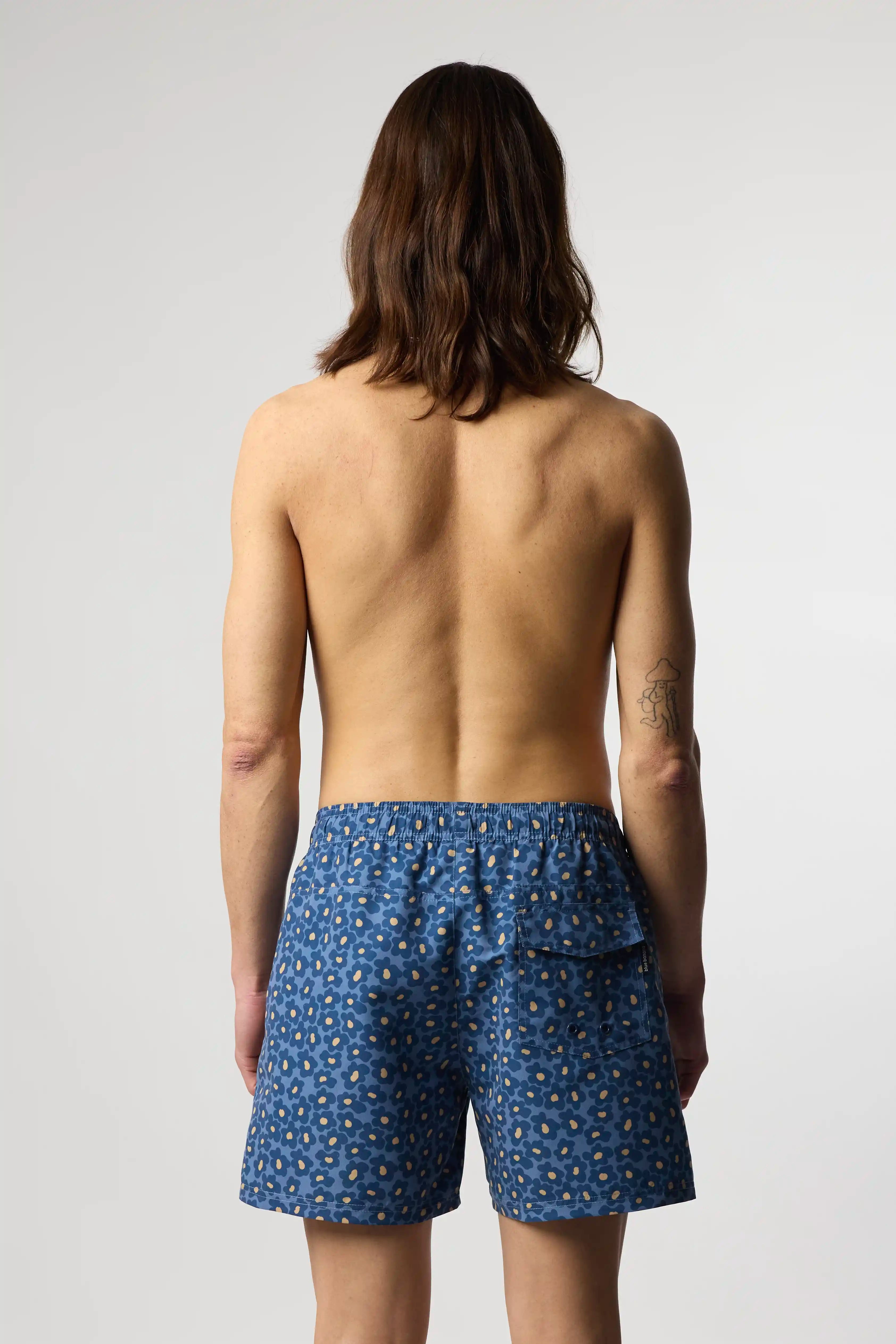 Fato de banho com estampa e corte reto. Cintura elástica, fecho com cordão e argolas emborrachadas. Etiqueta costurada na parte inferior direita. Bolsos laterais na frente e bolso traseiro na parte superior direita.
